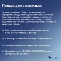 Функции портативного активатора воды: благодаря питью здоровой воды организм получает натуральный детокс, как бонус - снижение или нормализация веса, активированная вода укрепляет иммунитет, целебная влага без медикаментов снижает артериальное давление.