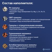 Состав наполнителя: антиоксиданты, ощелачиватель, дающий pH от 9 пунктов, натуральные минералы - кальций, магний, калий, литий, цинк, селен, хром и др, антибактериальный компонент обеспечивает удаление бактерий минимум на 96%, турмалиновый активатор воды, компонент, создающий инфракрасное излучение. В каждой бутылке 60 грамм гранул. Ресурс гранул до 6 месяцев полноценного использования, или 360 литров воды.