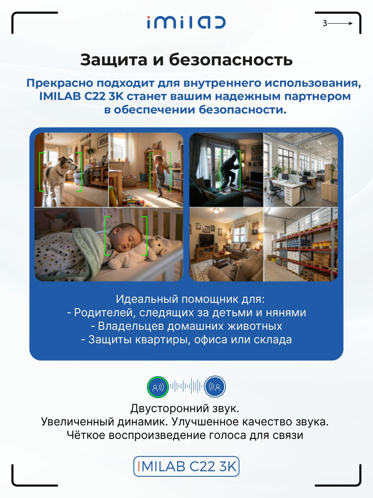 Более того, камера IMILAB C22 использует передовой и мощный алгоритм искусственного интеллекта, обнаружение людей и отслеживание движения с точностью 99,9%. Благодаря интеллектуальному обнаружению звука камера мгновенно оповестит вас, если уровень шума внезапно изменится, например, ребенок заплачет или включится сирена. Члены вашей семьи также могут просто помахать камере рукой, чтобы инициировать видеозвонок на ваш телефон.