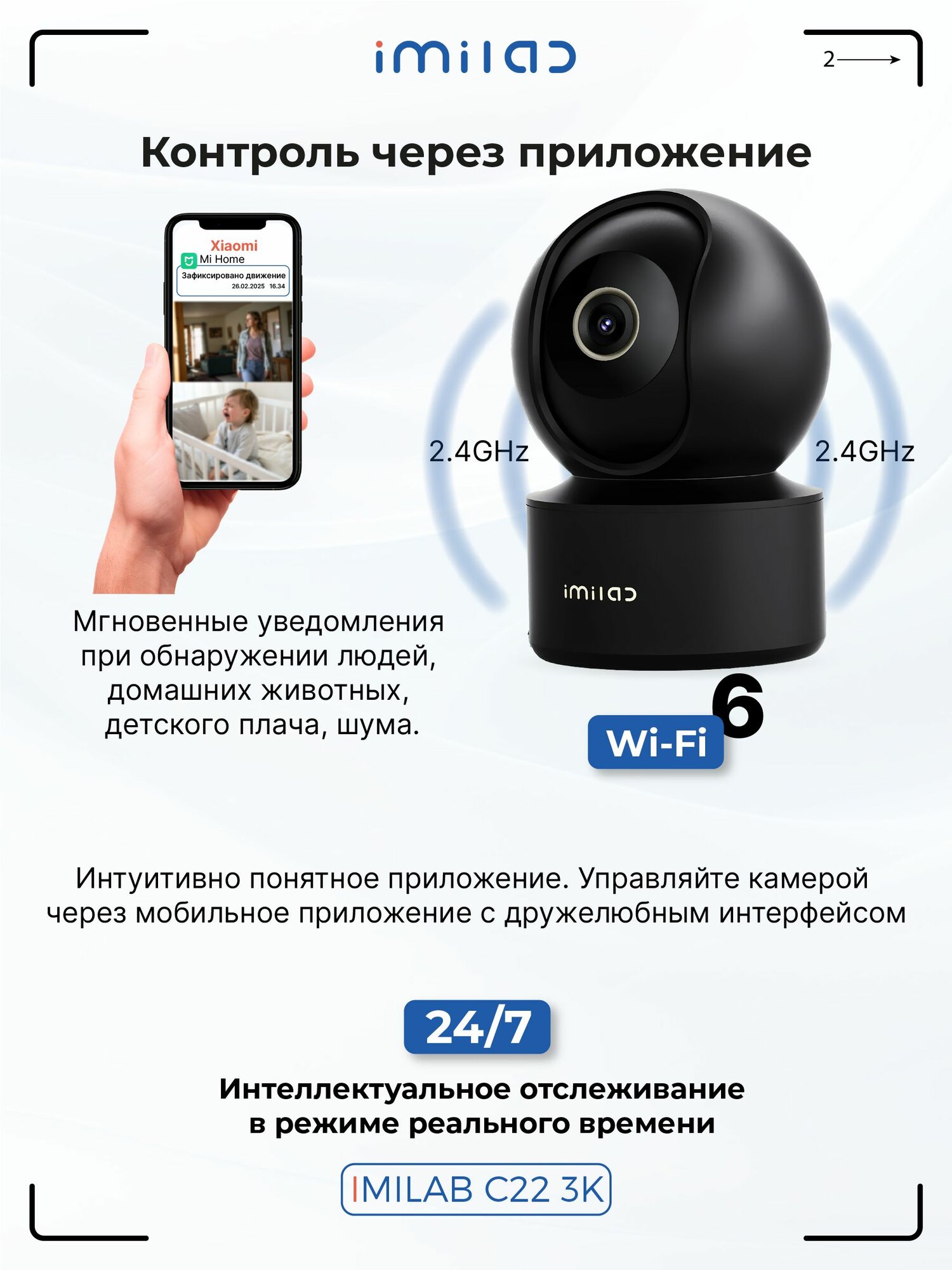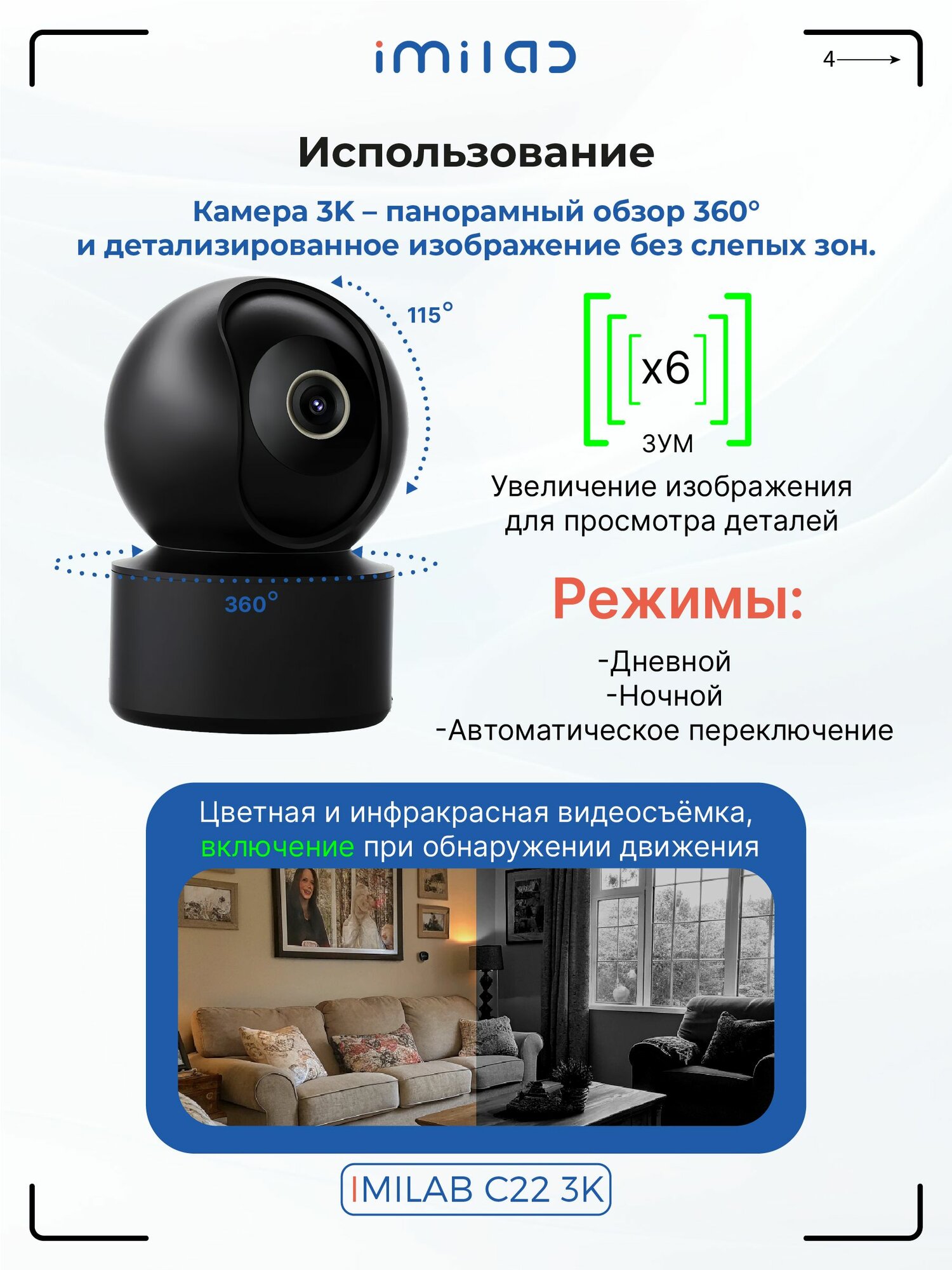 IP камера Imilab (Имилаб) 360° Home Camera C22 — это высокое качество изображение и круговой обзор помещения. Камера реагирует на движение и необычные звуки, поддерживает удаленный доступ и управление. Это первая камера для помещений, совместимая с маршрутизатором Wi-Fi 6 версии, который увеличивает скорость интернета до 30 % и обеспечивает более стабильное изображение в реальном времени. Она оснащена разрешением 5 Мп/3K, которое позволяет увидеть ваш дом в формате 3K и увеличить масштаб, чтобы рассмотреть детали без ухудшения качества изображения. Камера C22 также поддерживает функцию цветного ночного видения при слабом освещении, что позволяет четко наблюдать за ребенком, пока он спит.