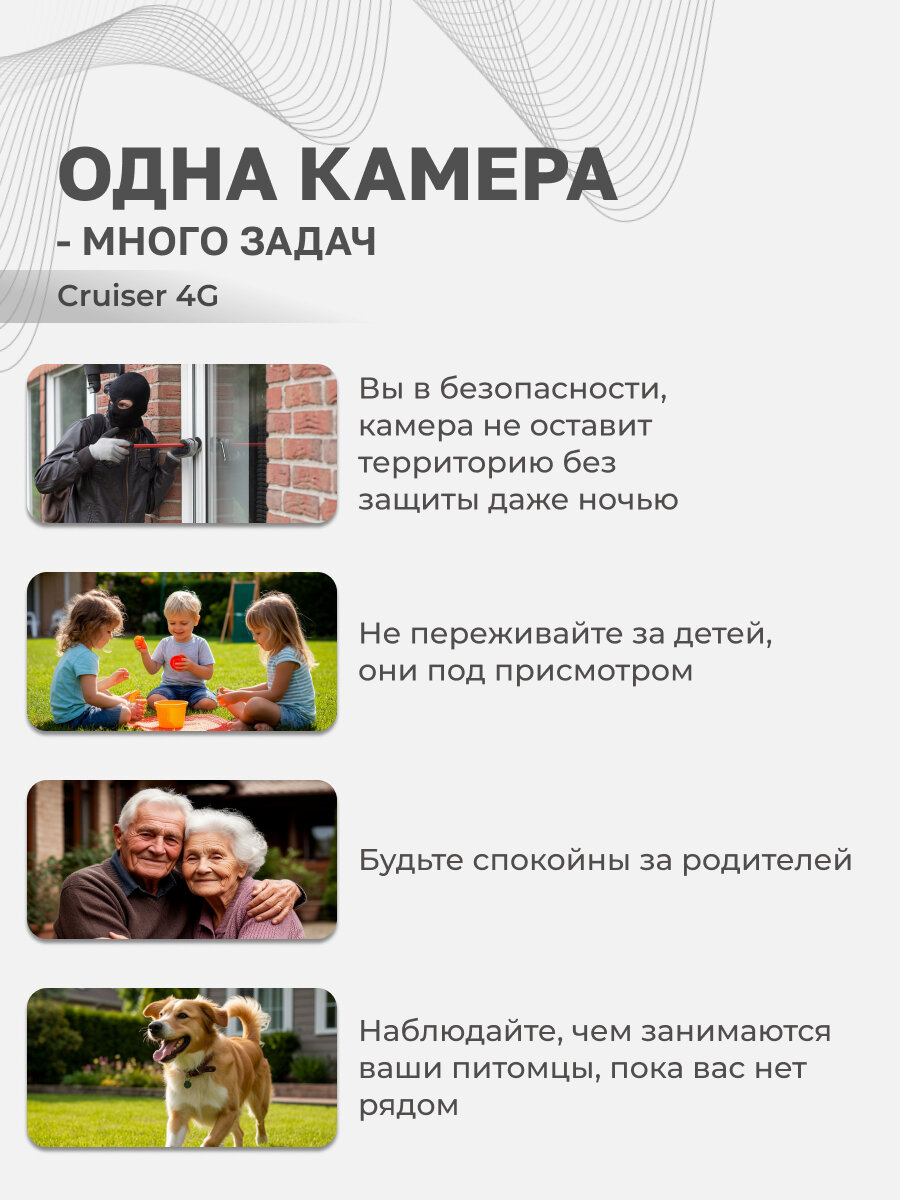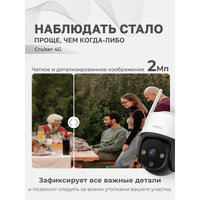 Камера оснащена 2-мегапиксельной прогрессивной CMOS-матрицей, что обеспечивает высокое качество изображения. Благодаря этому, вы сможете рассмотреть даже мелкие детали и распознать лица. Cruiser 4G передает качество видео до 1080P, таким образом, вы не пропустите ни одну деталь. Видеокамера также обладает цифровым зумом 8х, что позволяет вам видеть дальше. Водонепроницаемость уровня IP66 гарантирует защиту видеокамеры от проникновения пыли и влаги и позволяет адаптироваться к дождю и ветру, обеспечивая безопасность пользователей круглосуточно.