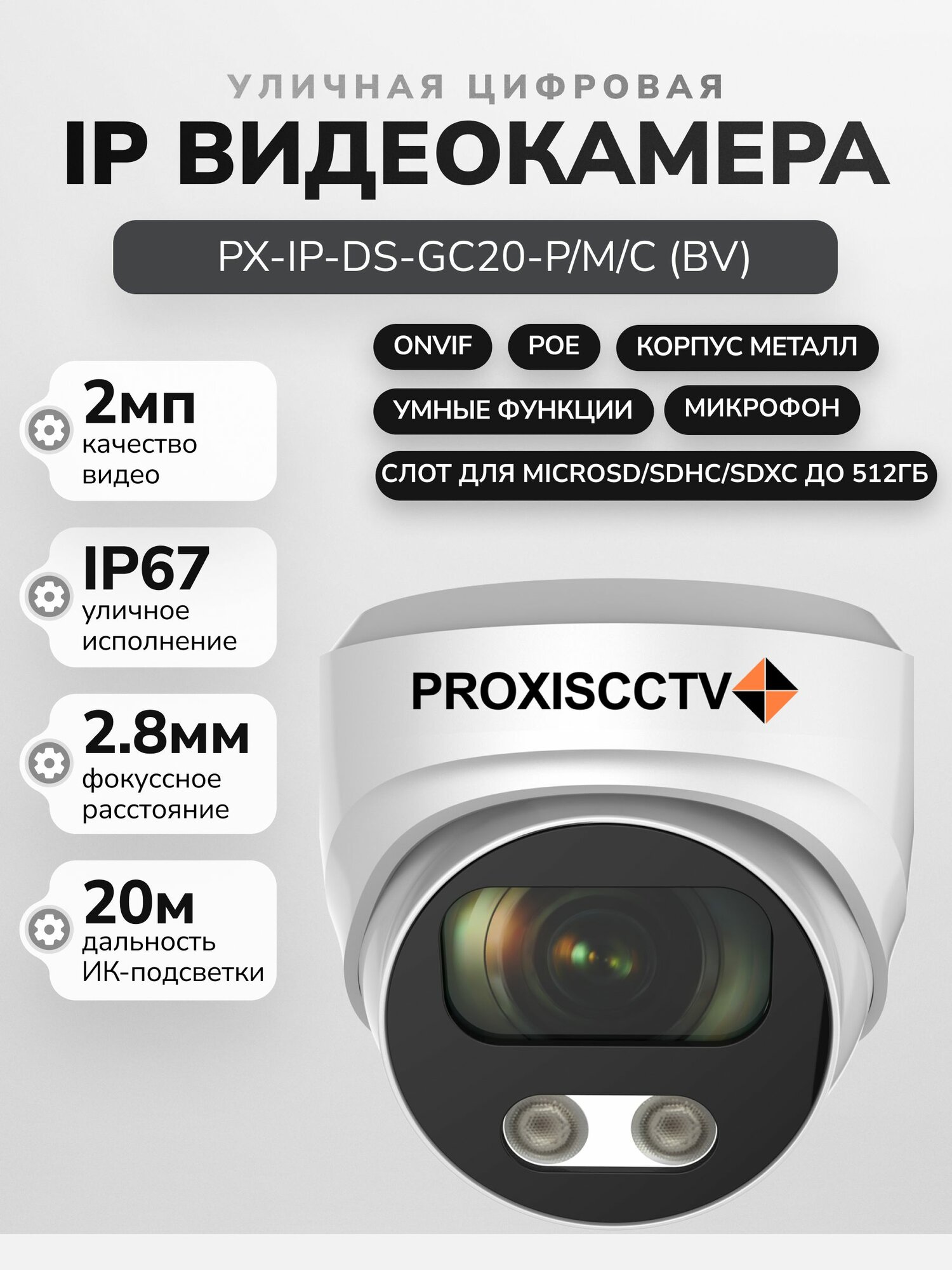 Купить IP камера видеонаблюдения уличная 2Мп, POE с микрофоном. Видеокамера купольная f-2.8мм, поддержка SD карты. Proxiscctv: PX-IP-DS-GC20-P/M/C (BV) с доставкой по всей России.