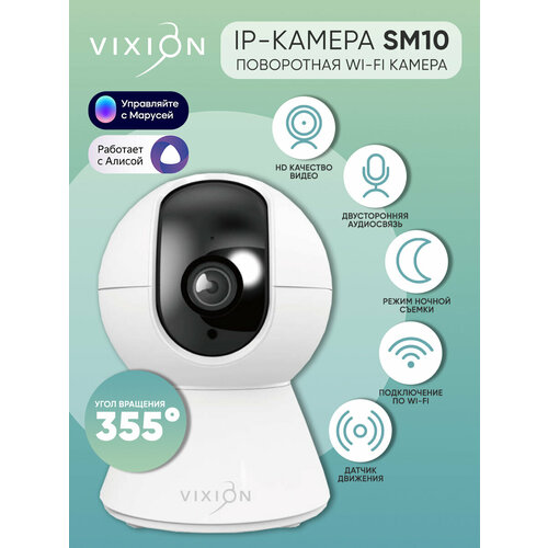 Поворотная IP-камера Vixion SM10 позволит организовать видеонаблюдение в любых помещениях, где есть доступ к сети интернет. Поддерживает разрешение 1920 х 1080, оснащена 2-мегапиксельной матрицей. Углы обзора камеры обеспечат комфортное изображение с широкой областью захвата. Горизонтальный угол поворота составляет 355°, а вертикальный 80°, изменить угол всегда можно через приложение в режиме реального времени. Подходит для съемки в темное время суток, с дальностью подсветки 5 метров. Встроенный микрофон обеспечит видео качественным звуком. Управление камерой осуществляется через приложение Vixion Home. Архив записей можно хранить на сервере или на карте памяти (в комплект не входит). Работает от сети 220в. Цвет устройства – белый. Камера проста в установке и настройке.