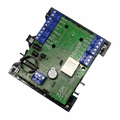 IP-контроллер СКУД IronLogic Z-5R мод. WEB BT Быстрый монтаж и подключение Автономный и сетевой режим работы Отсутствие необходимости в конвертере Подключение через сети: Ethernet, Wi-Fi Web-интерфейс для конфигурирования модуля связи и начальных установок модуля контроллера Режим Обычный / TRIGGER / Блокировка / Свободный проход Контроллер Z-5R (мод. Web BT) предназначен для использования в системах контроля и управления доступом (СКУД), и обеспечивает управление одной точкой доступа (точкой прохода). Контроллер поддерживает работу в автономном и сетевом режимах. Заполнение банков ключей в автономном режиме осуществляется с помощью мастер- ключа. В сетевом режиме работа контроллера и заполнение банков ключей осуществляется по сети с помощью внешней управляющей программы. Кроме занесения карт в сетевом режиме можно считывать события, устанавливать текущее время в контроллере и настраивать временные зоны для прохода каждой карте. Для реализации сетевого режима работы контроллер обеспечивает возможность подключения к локальной сети через Ethernet или по Wi-Fi. При потере связи с управляющей программой в сетевом режиме контроллер продолжает работать автономно, накапливая события в буфере событий. Доступ через точку прохода осуществляется на основе проверки статуса предъявляемых идентификаторов (proximity-карт, ключей Touch Memory или pin-кодов), которые далее будем называть ключами. По функциональному назначению контроллер различает ключи, предназначенные для прохода, и ключи, предназначенные для программирования контроллера. Ключи для прохода могут быть простыми и блокирующими. Блокирующие ключи имеют более высокий статус. В штатном режиме контроллер «разрешает» проход и по простым, и по блокирующим ключам. В режиме «Блокировка» проход по блокирующим ключам разрешён, но закрыт проход по простым ключам (например, при выдаче работникам простых ключей, а сотрудникам охраны - блокирующих ключей, в рабочее время в штатном режиме можно обеспечить проход всем категориям работников, а в ночное время в режиме блокировки проход будет разрешён только сотрудникам охраны). Ключи для программирования контроллера называются мастер-ключами. Они предназначены только для программирования контроллера без компьютера и не предназначены для прохода. Мастер-ключи позволяют: добавлять/удалять простые, блокирующие и мастер-ключи, задавать время подачи открывающего сигнала на запорное устройство (разрешения доступа), включать/отключать режим прохода «Accept». В режиме «Accept» любой ключ воспринимается как разрешённый и заносится в память контроллера как простой ключ для прохода. Режим используется для формирования базы ключей при установке СКУД на объекте в случае, когда ключи для прохода уже выданы. Тогда, находясь в течение некоторого времени в режиме «Accept», контроллер «собирает» информацию о предъявленных ключах, а после включения штатного режима проход будет осуществляться только по ключам, записанным в его память. Для получения кодов ключей контроллер поддерживает подключение 2-х считывателей (для входа и для выхода) по протоколам Wiegand (26, 34, 42, 50) или iButton (Dallas Touch Memory). Для каждого считывателя память контроллера содержит по отдельному банку ключей. После проверки прав доступа контроллер выдает сигнал управления (замыкание/размыкание силового транзистора) на запорное устр