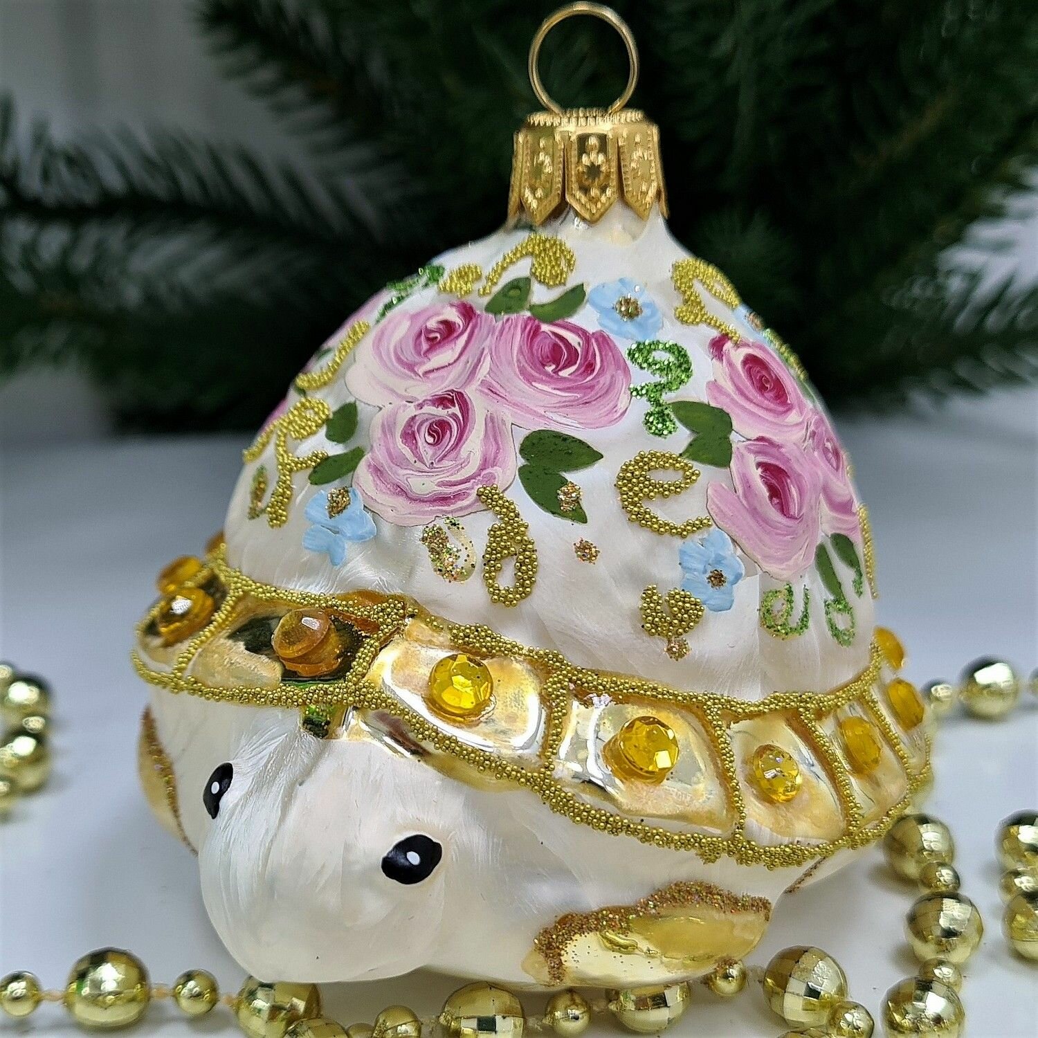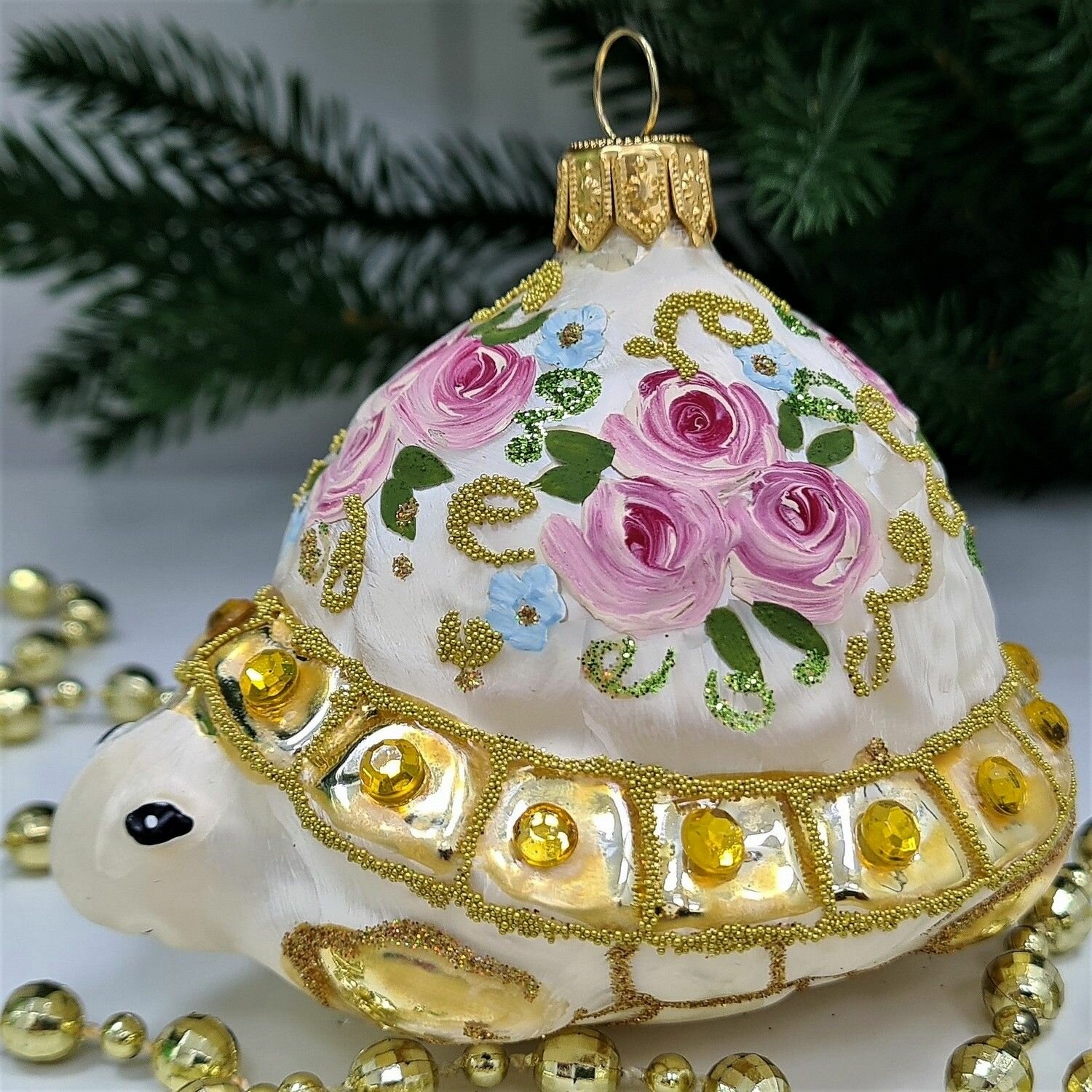 Стеклянная ёлочная игрушка Irena-Co Черепаха Версаль изготовлена из стекла, что придает ей особую изящность и хрупкость. Ручная роспись делает каждую игрушку уникальной и неповторимой.
