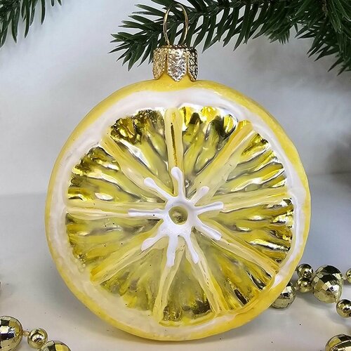 В комплекте идет одна стеклянная ёлочная игрушка Долька лимона малая.