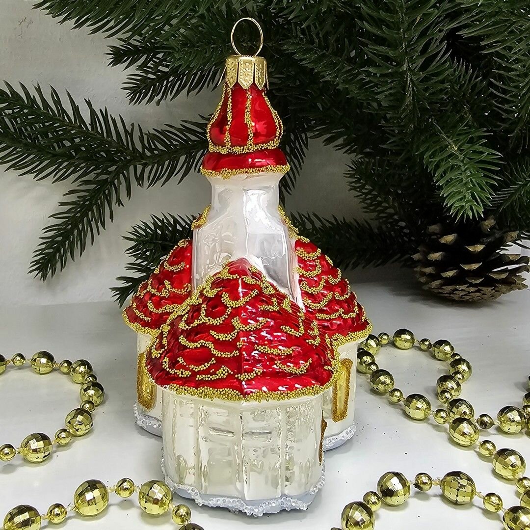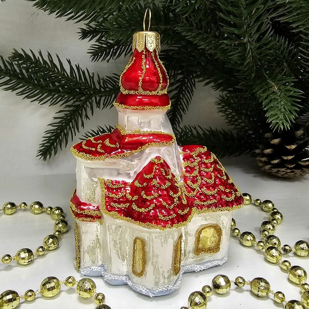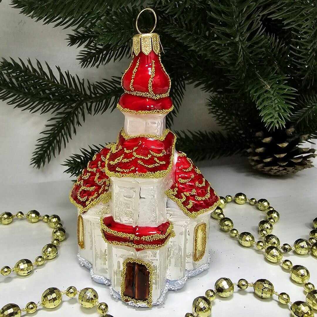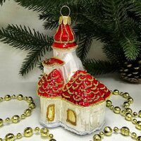 В комплекте идет одна стеклянная ёлочная игрушка Домик размером 10х7х6 см.