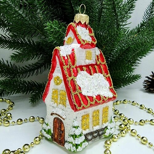 Игрушка выполнена в форме домика с острой красной крышей и снегом, что придает ей неповторимый новогодний вид. Ручная роспись делает каждую игрушку уникальной, а разнообразие цветов позволяет создать действительно оригинальную елку.