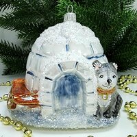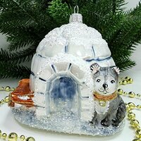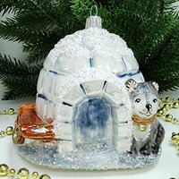 Изящная форма игрушки в виде иглу с собачкой и санками привнесет в ваш интерьер стиль и изысканность. Ручная роспись каждой игрушки делает ее особенно ценным элементом новогоднего декора.