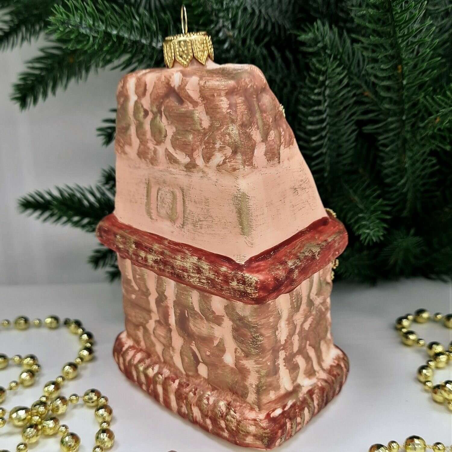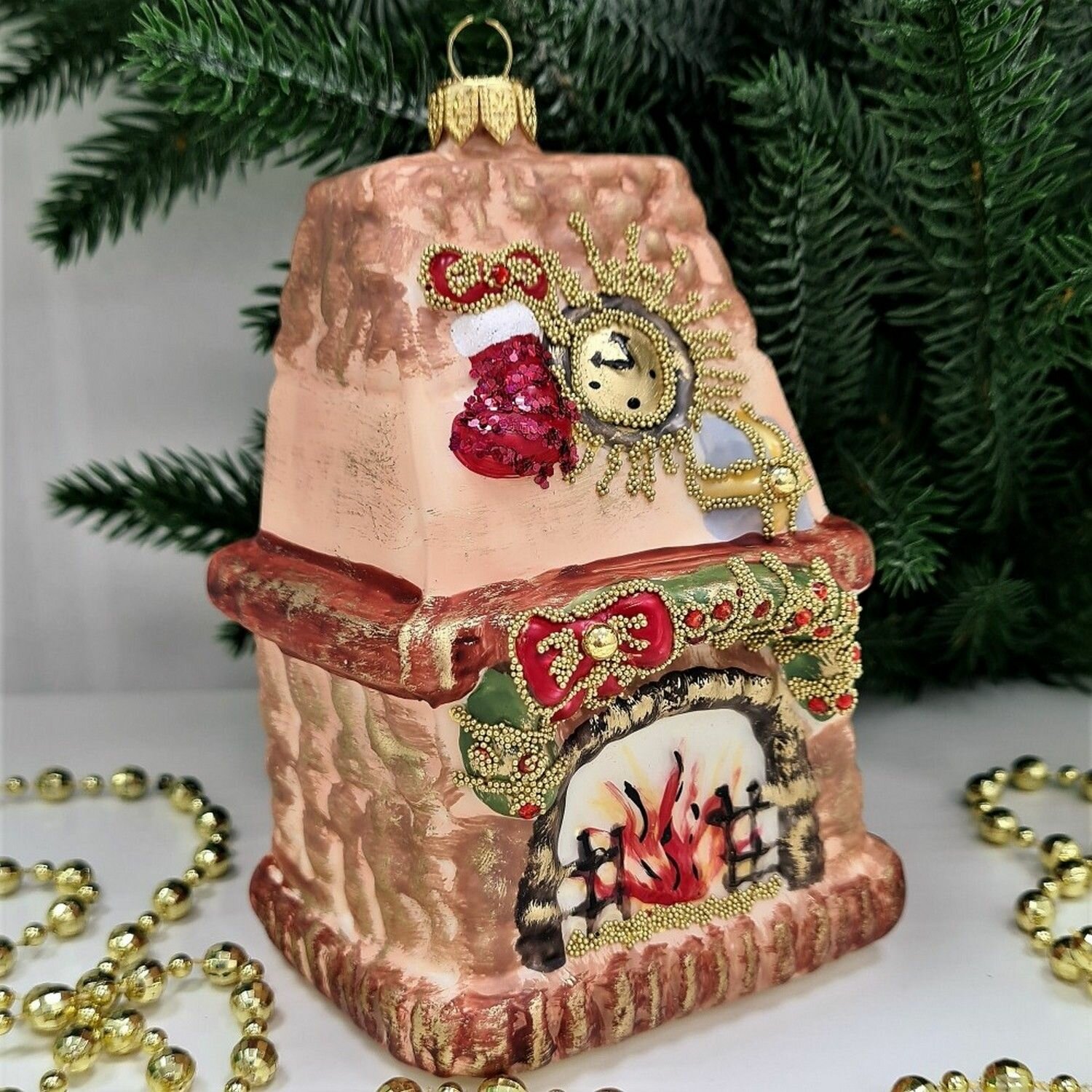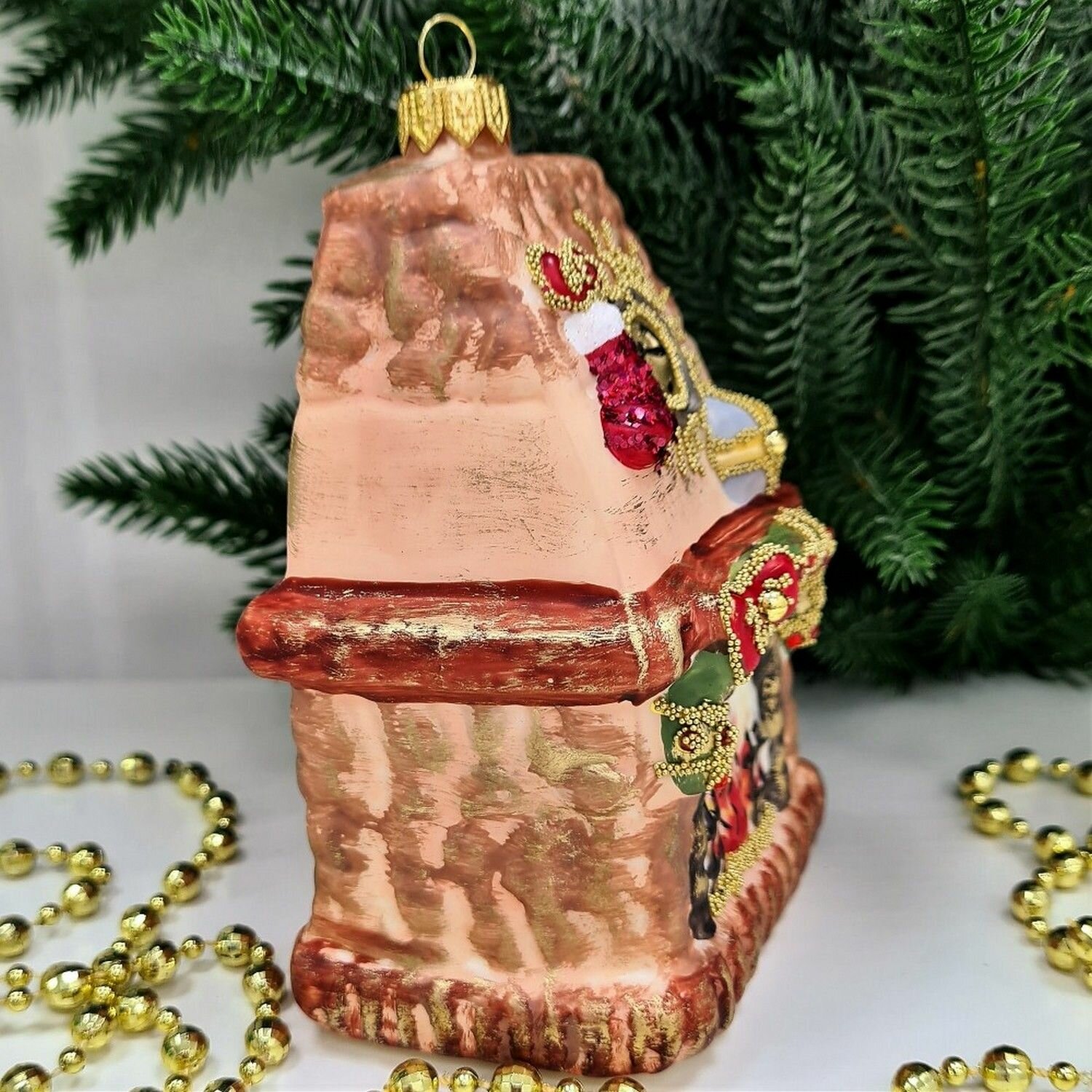 Игрушка выполнена в форме камина, что символизирует наступление светлого праздника Рождества и Нового года. Горящий огонь на камине символизирует семейный уют, а красный сапог - много-много рождественских подарков. Ручная роспись придает игрушке неповторимый вид и делает каждую из них уникальной.