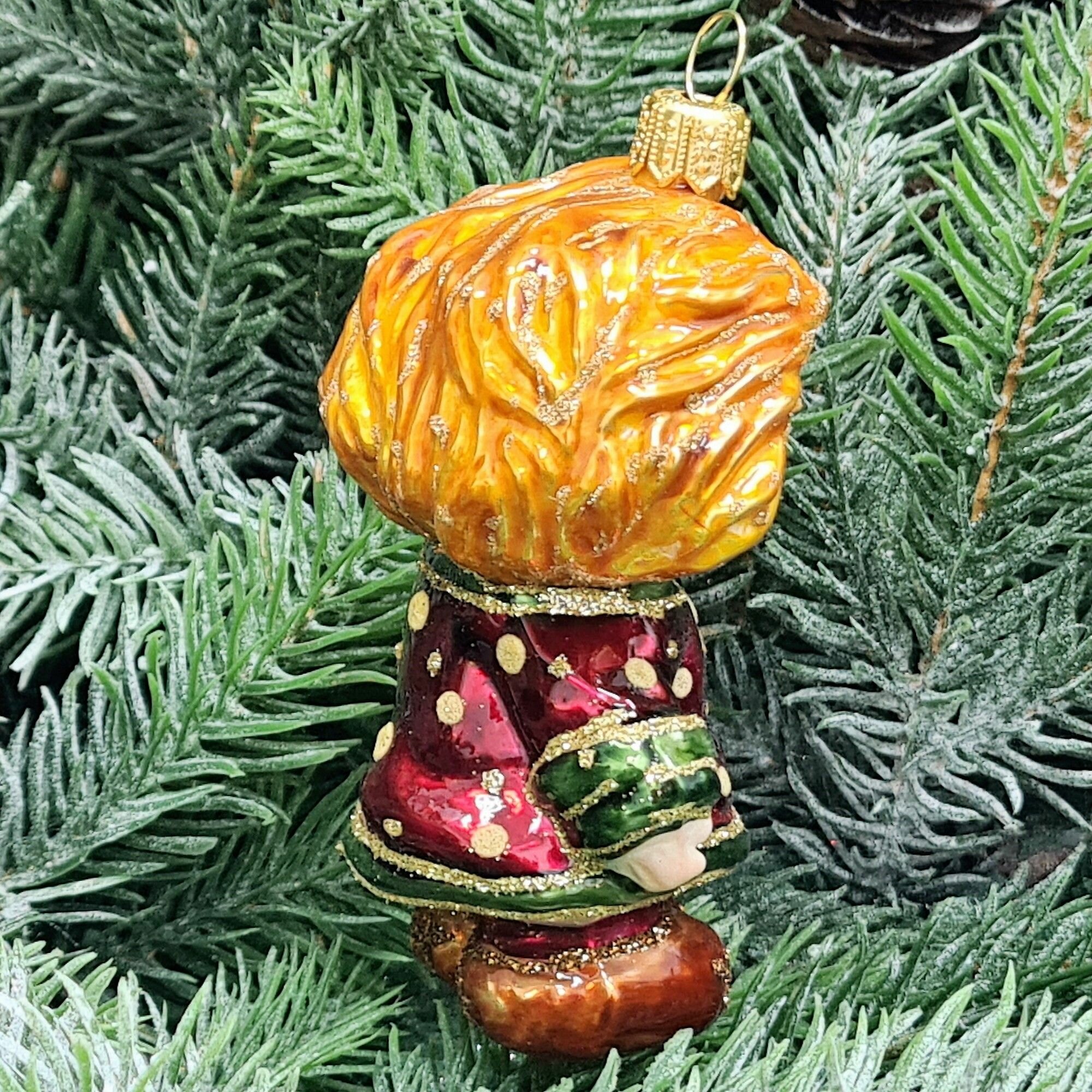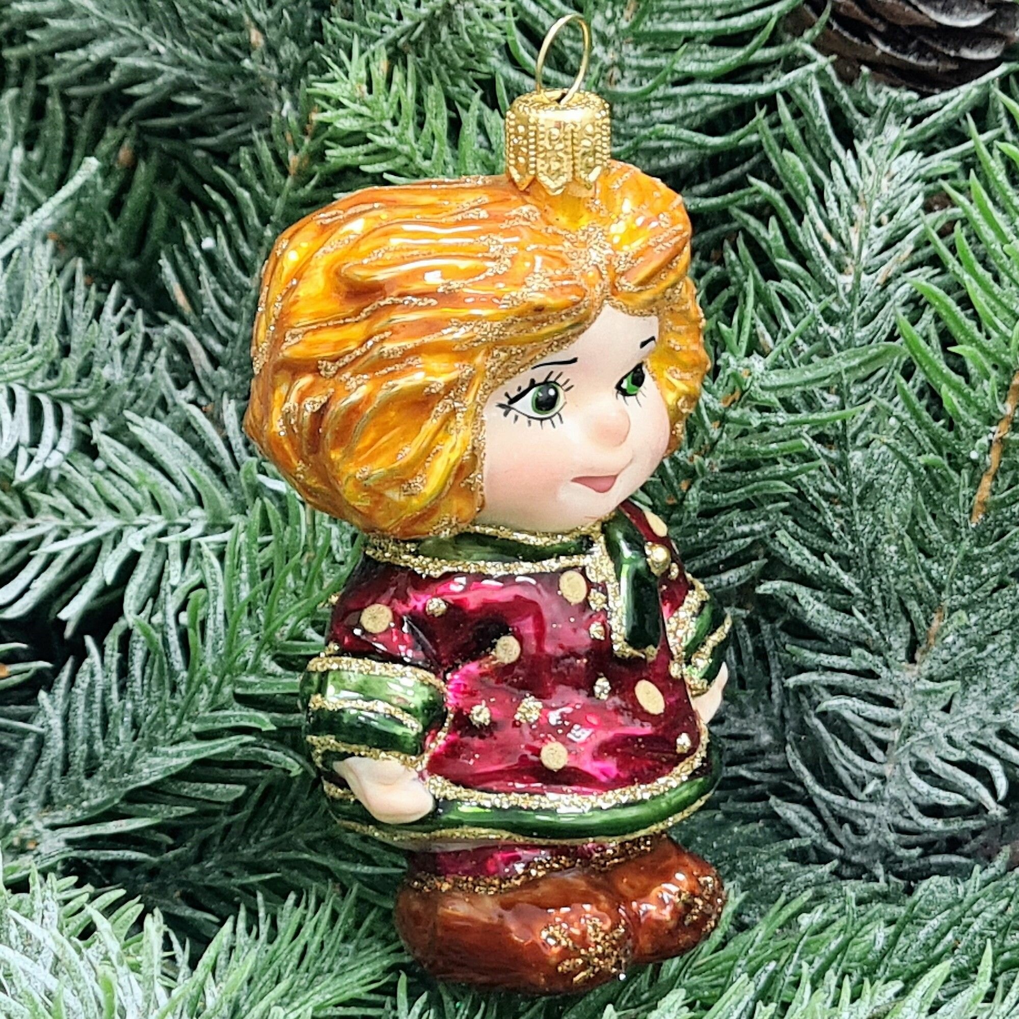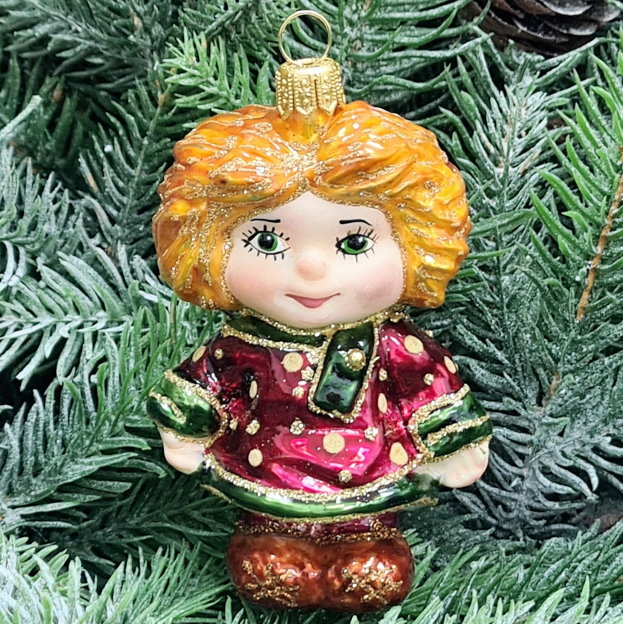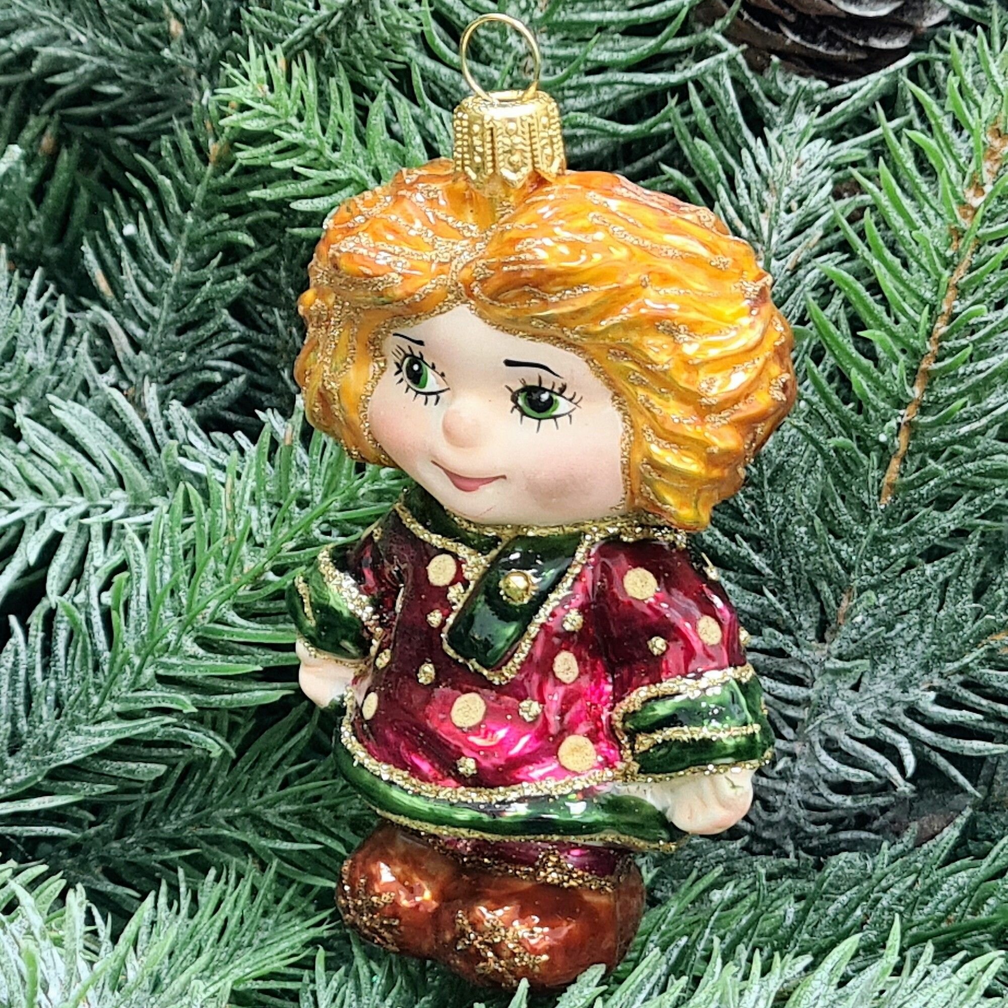 Стеклянная ёлочная игрушка "Лохматый мальчик" станет ярким акцентом и привлечет внимание гостей, создавая уникальную и теплую предновогоднюю атмосферу.