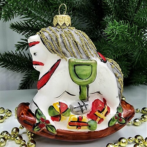 Стеклянная ёлочная игрушка Irena-Co Лошадка-качалка станет отличным выбором для тех, кто ценит качество, красоту и уникальность.