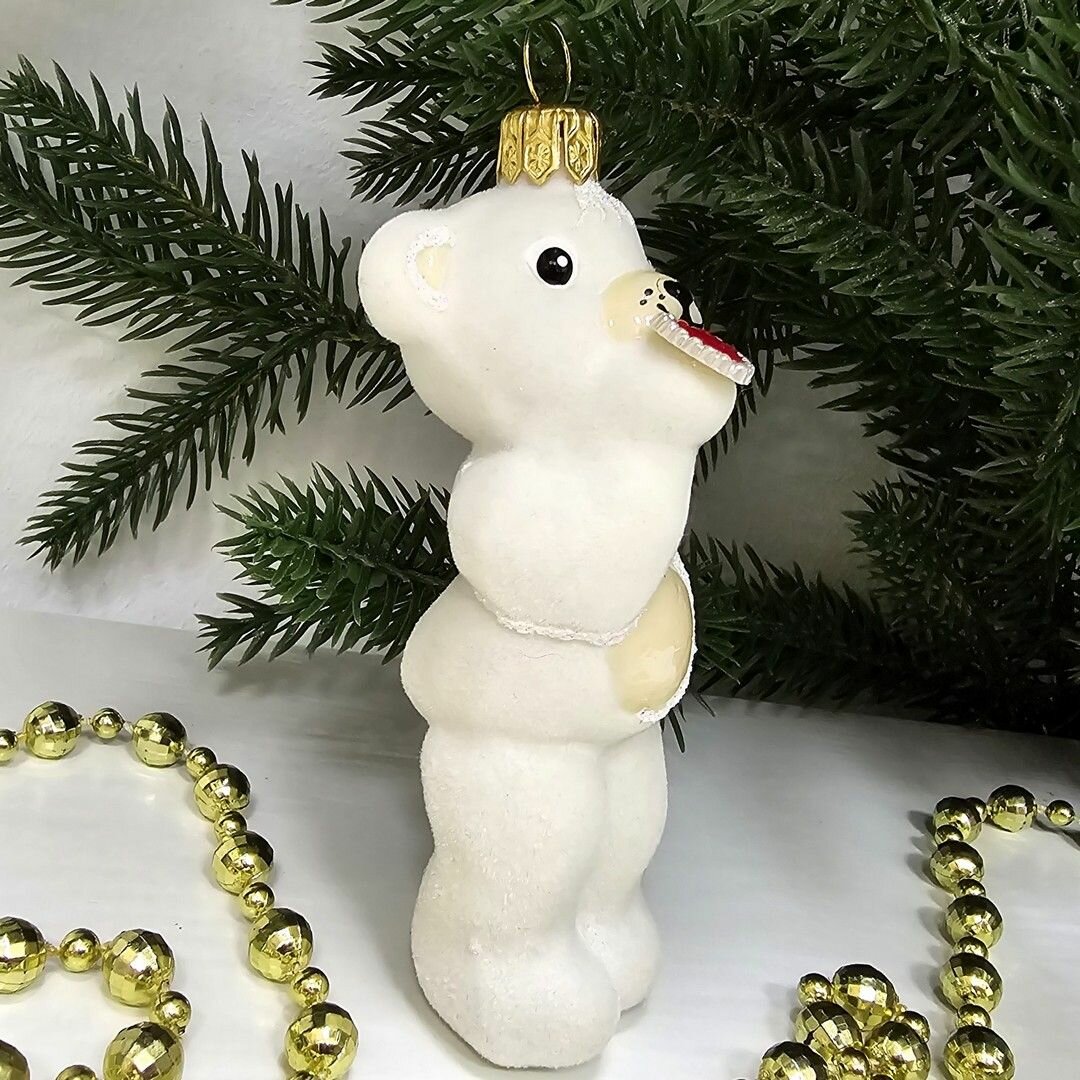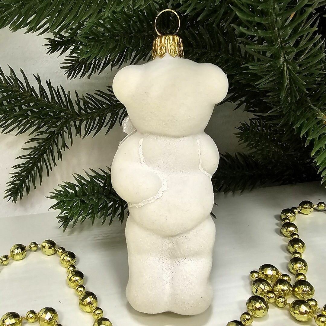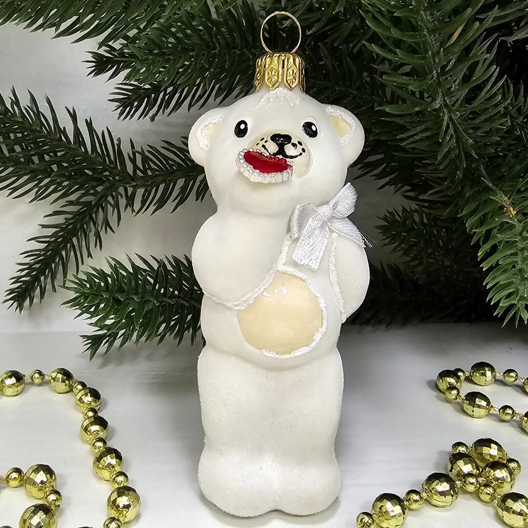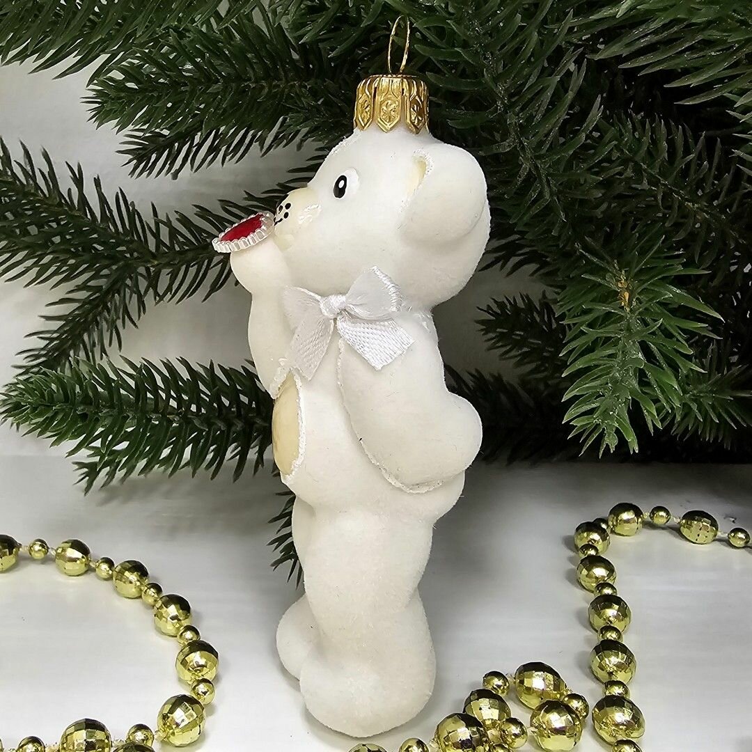 Игрушка выполнена в виде милого белого медвежонка с красным печеньем, что придает ей особую трогательность и нежность. Ручная роспись делает каждую игрушку уникальной, а разнообразие цветов и принтов позволяет создать действительно оригинальную елку, которая будет радовать глаз.