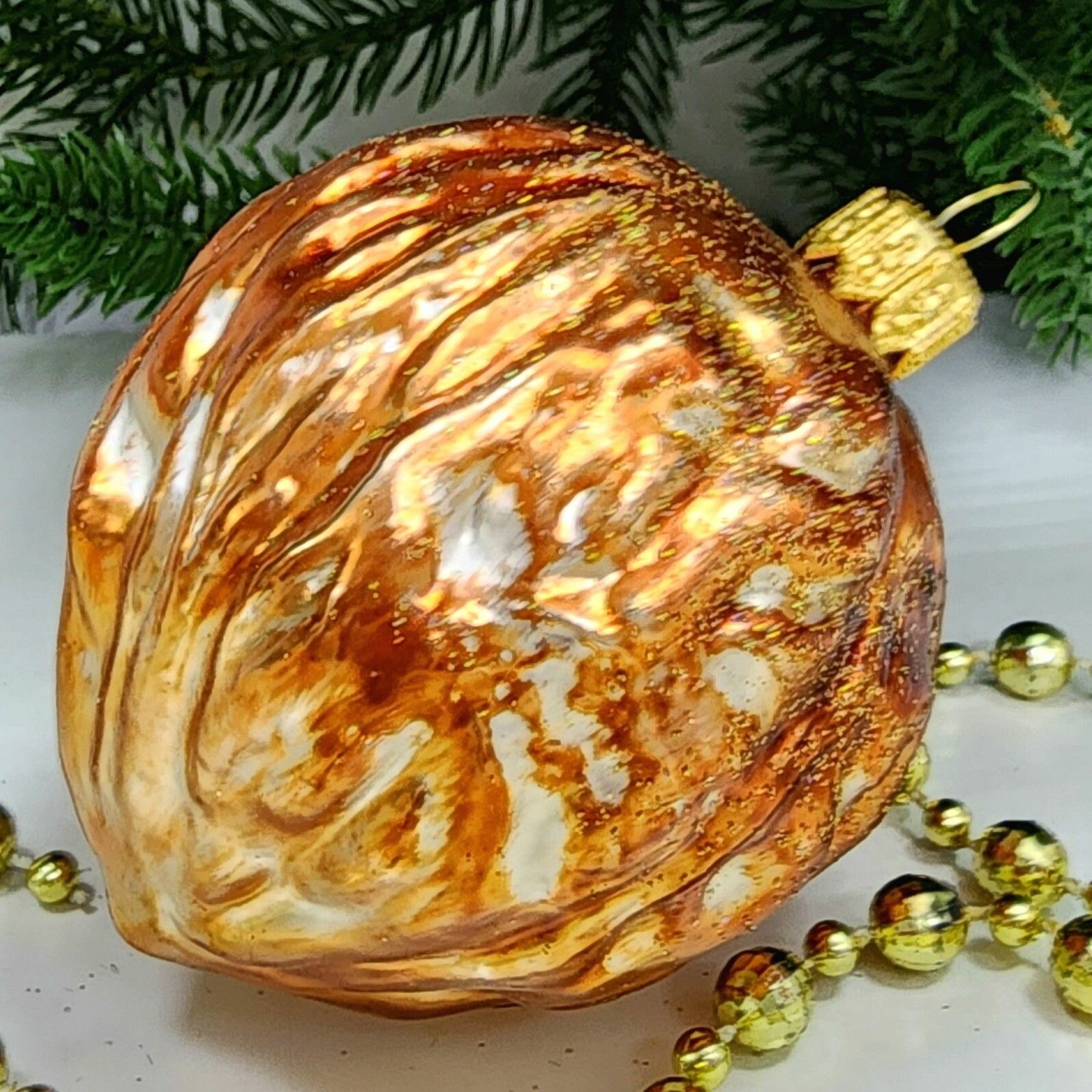 Стеклянная ёлочная игрушка Irena-Co Орех винтаж представляет собой реалистичный орешек из стекла, который станет отличным дополнением к оформлению вашей елки. Золотисто-коричневый цвет игрушки дополнен серебряными мазками краски и блестками, что придает ей винтажный вид.