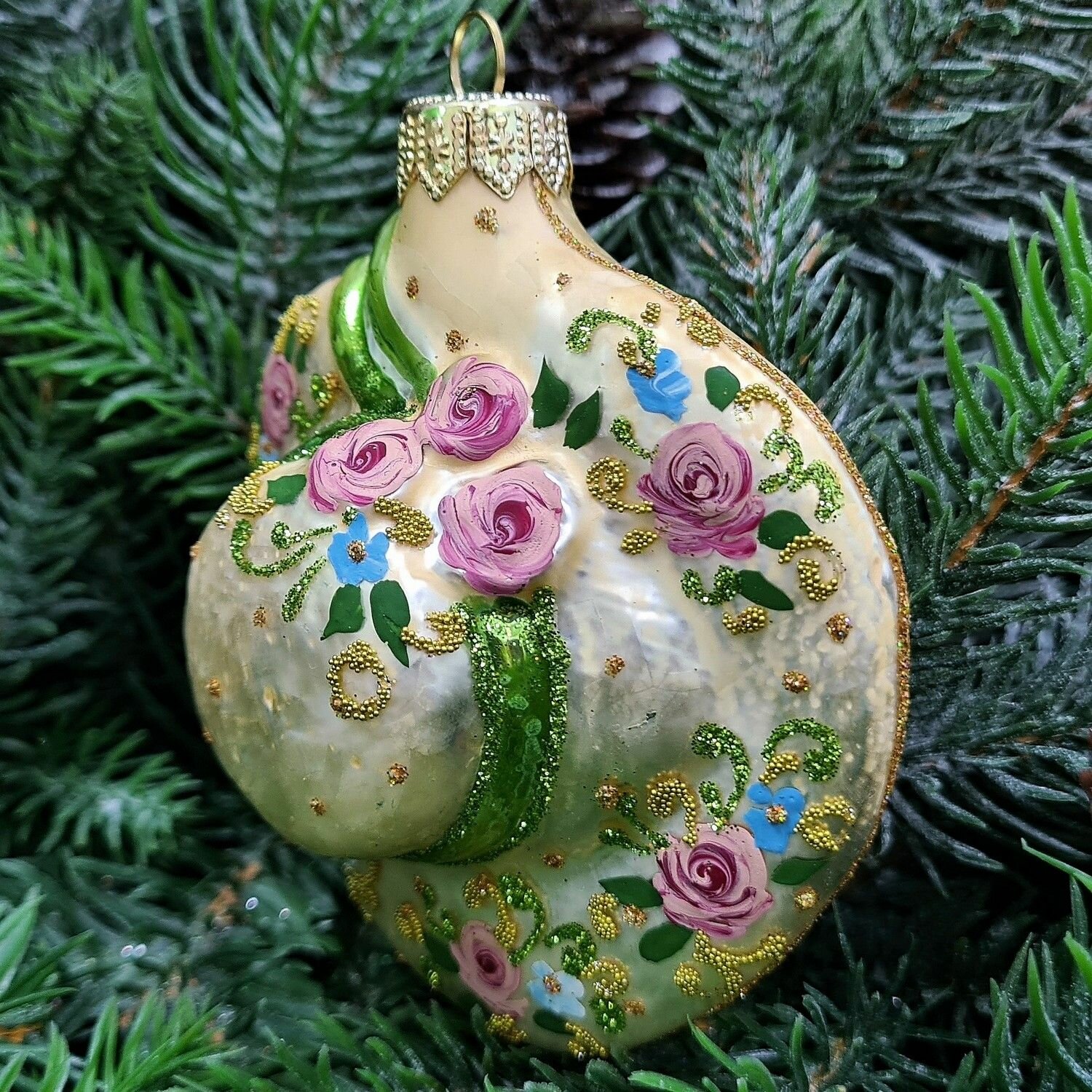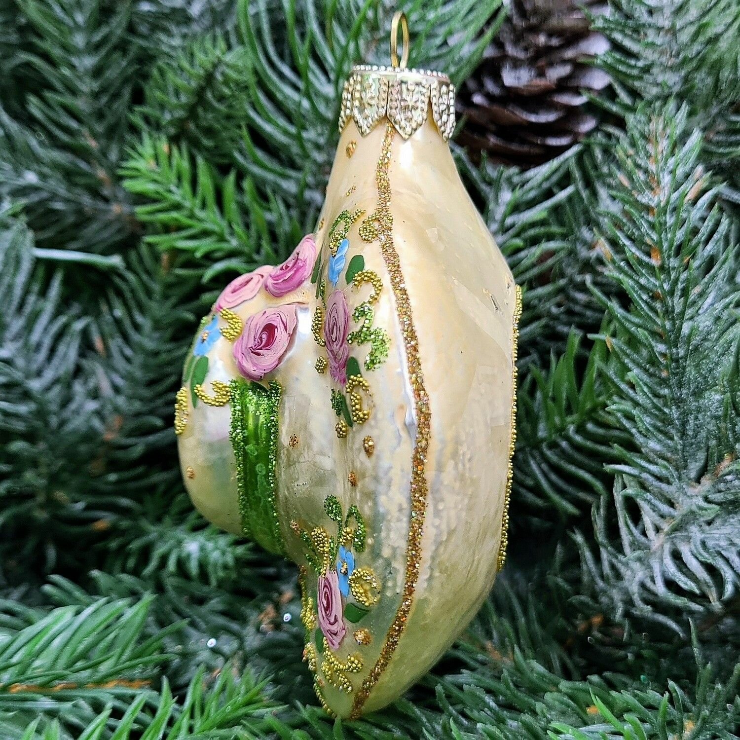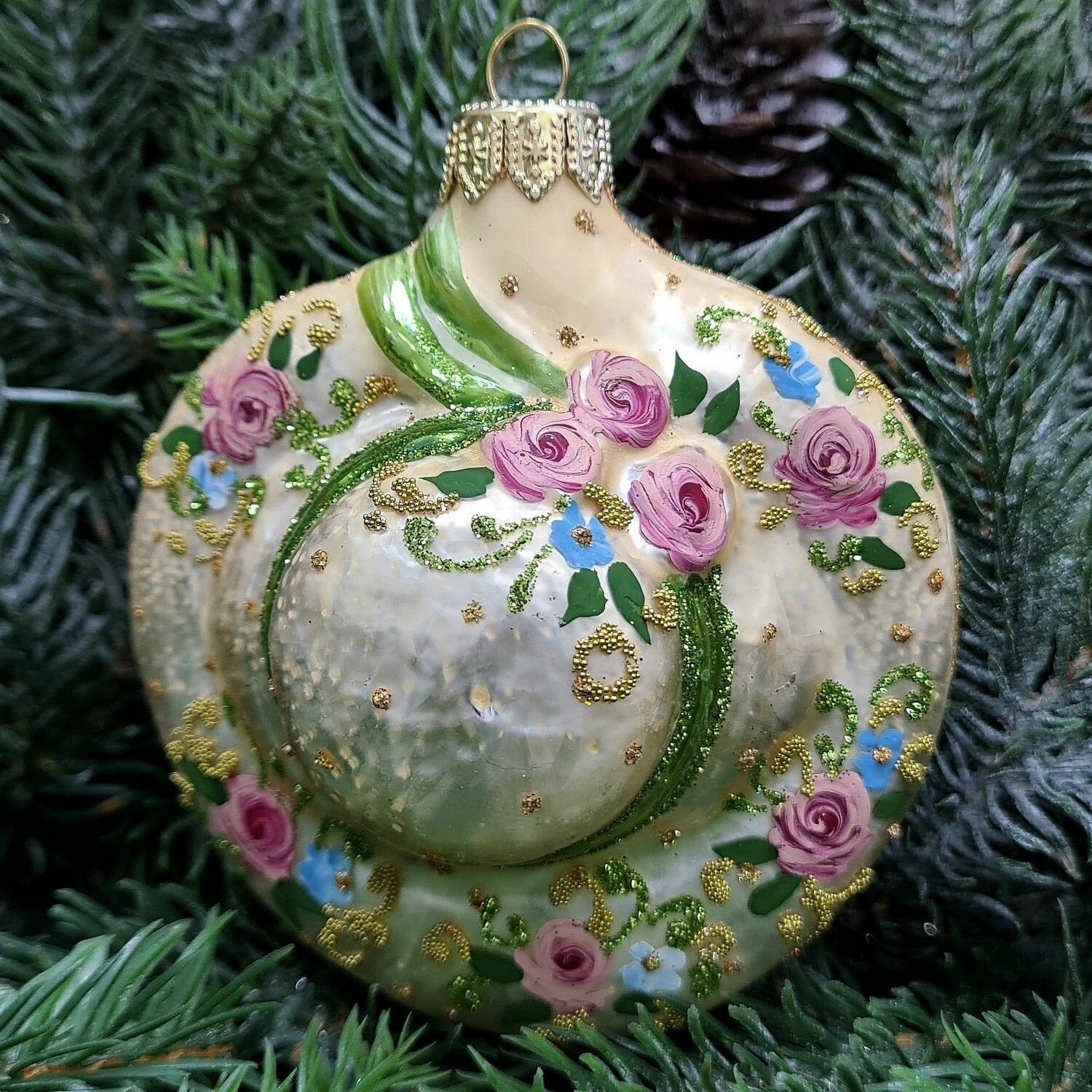 Игрушка выполнена в форме шляпки Версаль и украшена изысканным узором на золотом фоне. Это произведение искусства, созданное для того, чтобы радовать глаз и поднимать настроение.