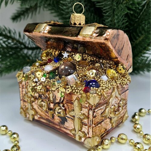 Игрушка выполнена в форме сундука с золотом, что обещает богатство и роскошь. Под крышкой сундука спрятаны блеск золота, жемчуга и драгоценных камней, что делает украшение еще более привлекательным.