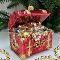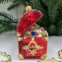 В комплекте идет одна стеклянная ёлочная игрушка Сундук с золотом красный.
