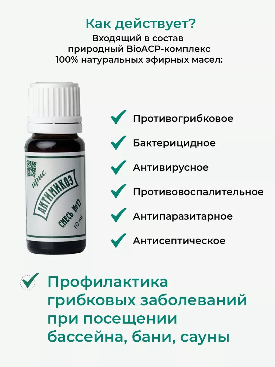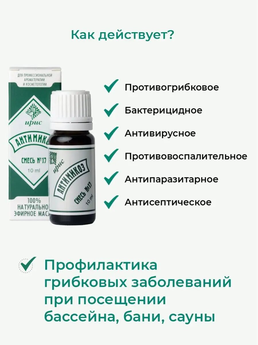 Смесь эфирных масел ирис «Антимикоз» для бани, сауны, грибка ногтей и кожи, 10мл: сравнение цен, характеристики, фото, актуальное наличие и цены.