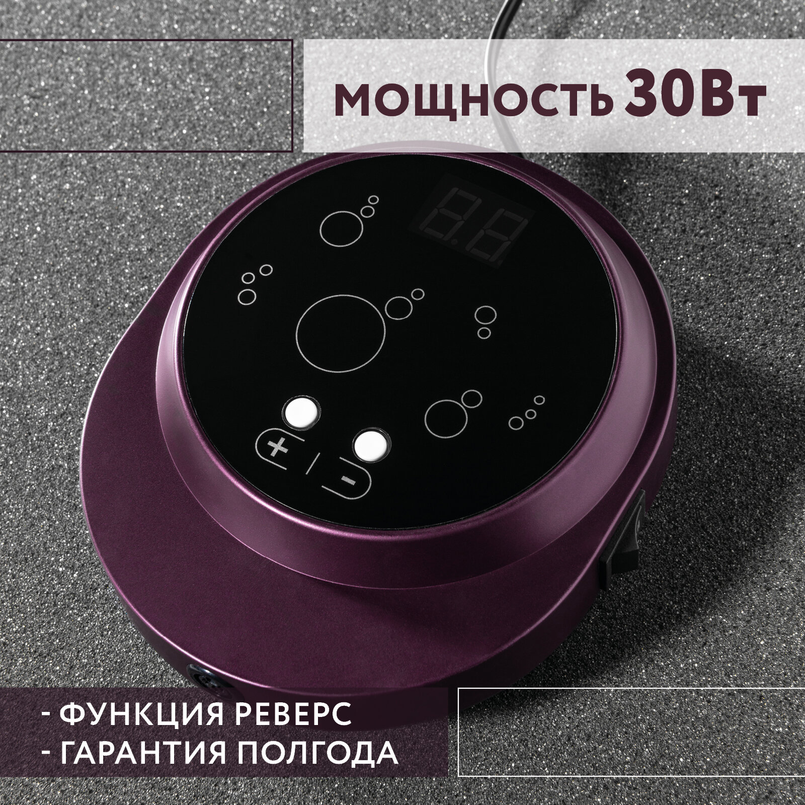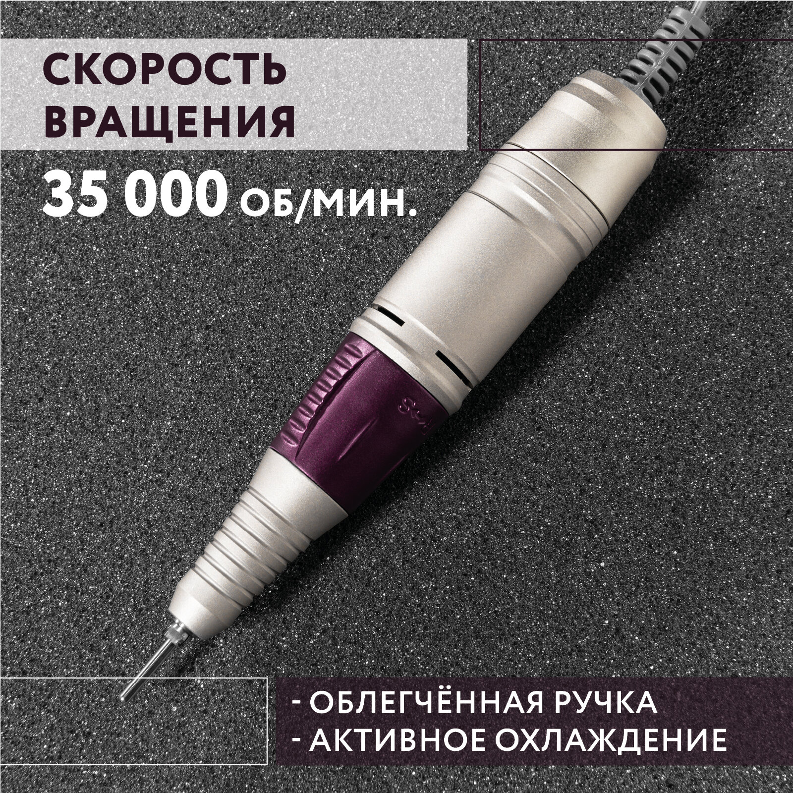 автоотключение при перегрузке, дисплей, набор фрез в комплекте, отсутствие вибрации, педаль, плавная регулировка, подсветка, подставка для наконечника, цанговый зажим фрезы