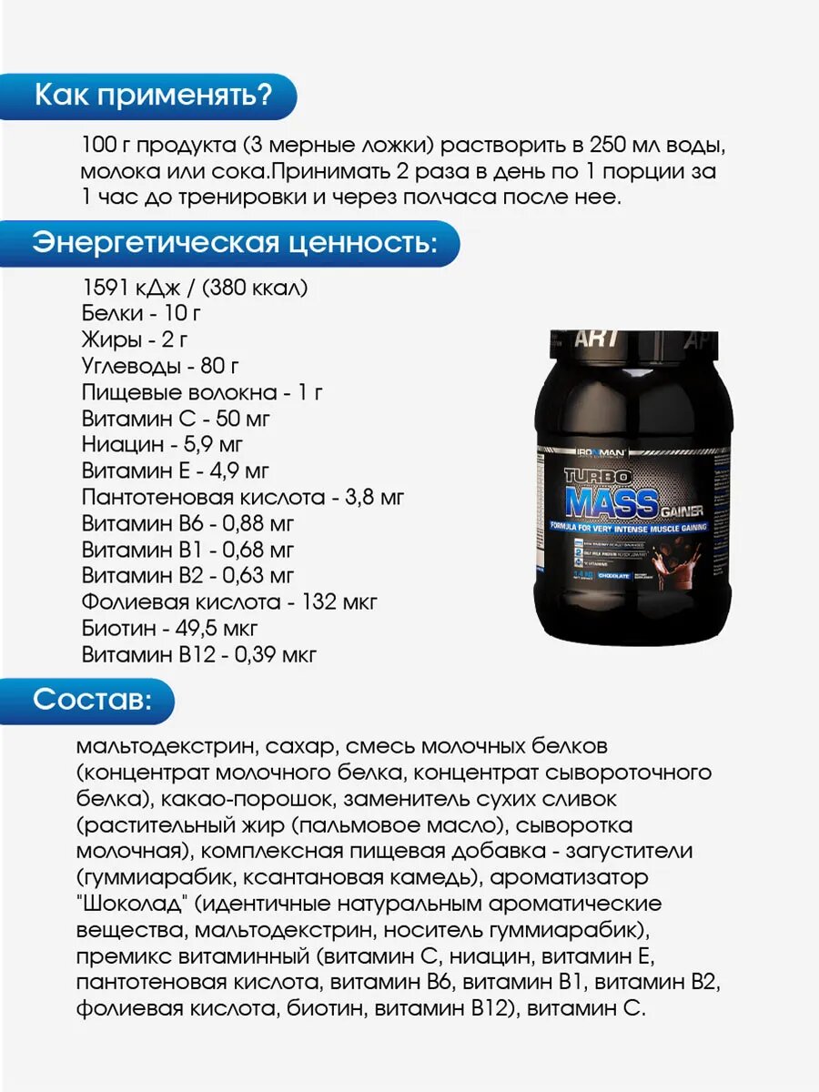 размер порции: 100 г; калорийность порции: 388 ккал; рекомендации по применению: в зависимости от программы питания смешайте 4-8 столовых ложек (50-100г) Турбо Масс Гейнер с 150-300 мл воды, молока или фруктового сока. Полученный коктейль рекомендуется принимать по 1 порции за час до тренировки и через полчаса после нее.; состав: концентрат сывороточного белка Armor Proteines S.A.S. (Франция), концентрат молочного белка Murray Goulburn Co (Австралия), мальтодекстрин, натуральный или идентичный натуральному ароматизатор Rudolf Wild GmbH (Германия), смесь витаминов фирмы Doehler GmbH (Германия), загуститель Texogum фирмы Nexira (Франция), сахароза, какао (Германия)