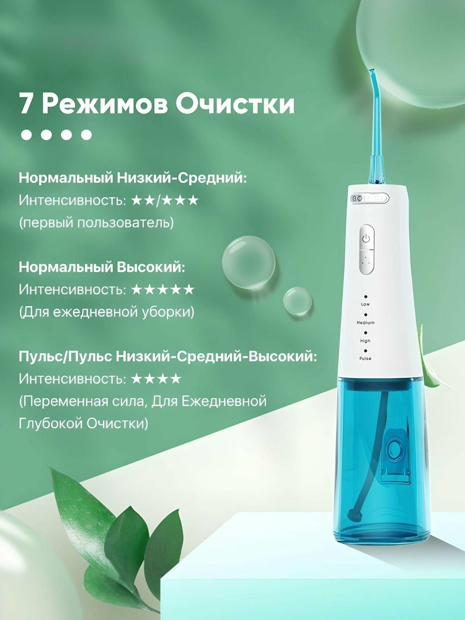 | Насадки | для струйной чистки, для чистки языка, ортодонтическая (для брекетов), пародонтологическая (для десен) |
