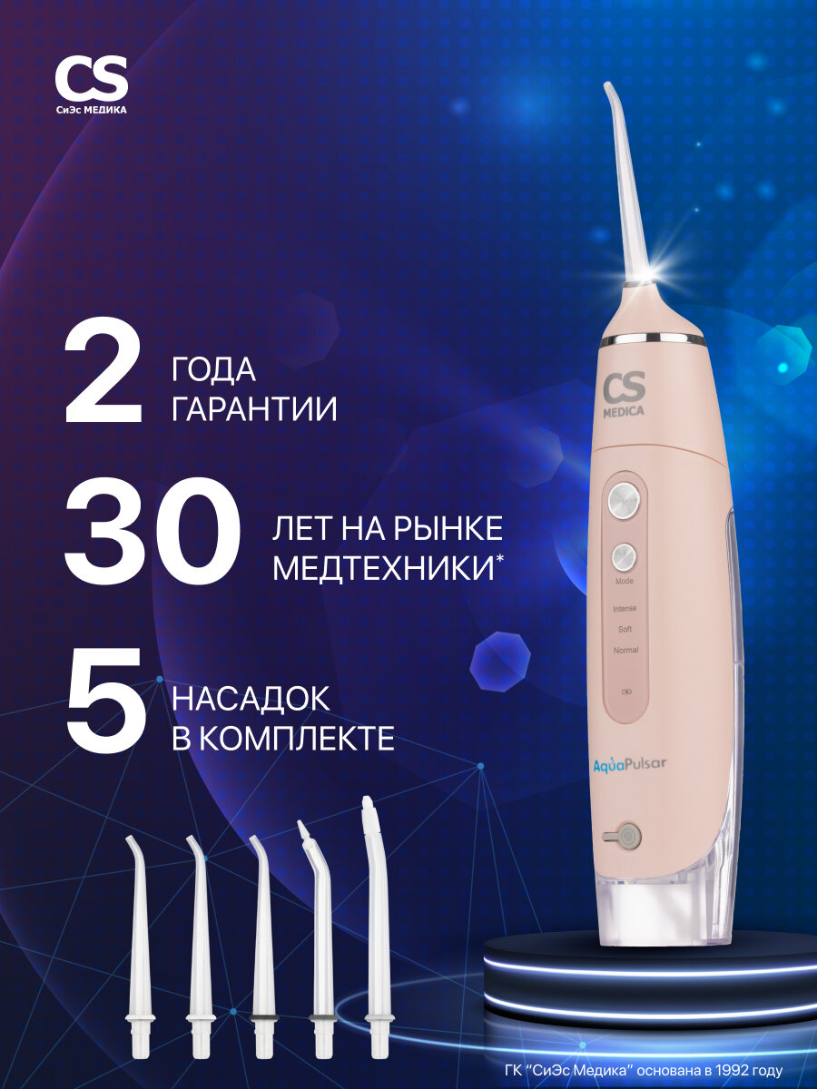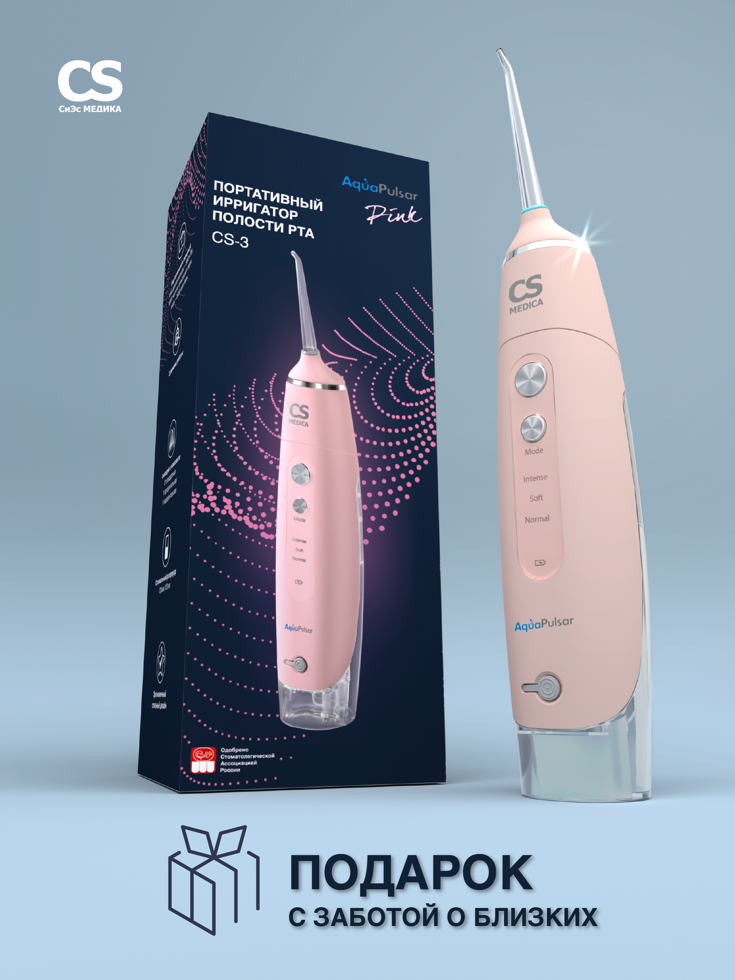 | Подробная комплектация | электронный блок с ручкой ирригатора CS Medica AquaPulsar CS-3 Portable, резервуар для растворов, насадки для ирригатора (стандартные (2 шт.), ортодонтальная (1 шт.), пародонтальная (1 шт.)), зарядное устройство CH-AP3, чехол для хранения и переноски, руководство по эксплуатации, гарантийный талон |