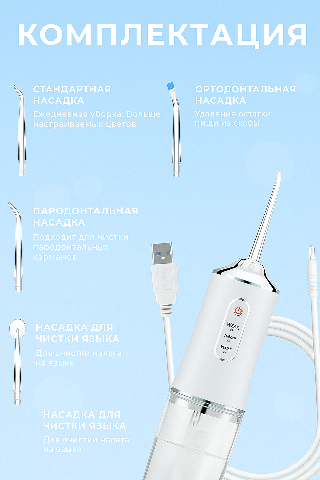 Ирригатор для чистки полости рта и зубов портативный с комплектом насадок и зврядным кабелем USB: сравнение цен, характеристики, фото, актуальное наличие и цены.