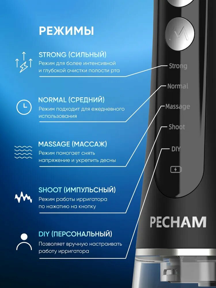 Ирригатор для полости рта и зубов PECHAM PC-117 поможет осуществлять профессиональный уход за полостью рта в домашних условиях, а также с его помощью можно удалять мягкий зубной камень и проводить домашнее отбеливание.