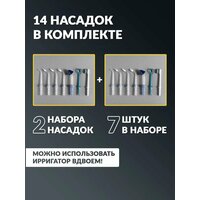 | Насадки | для струйной чистки, для чистки имплантов и коронок, для чистки языка, назальная, насадка-щетка, ортодонтическая (для брекетов) |