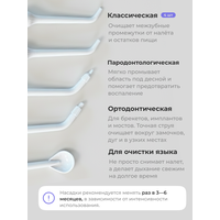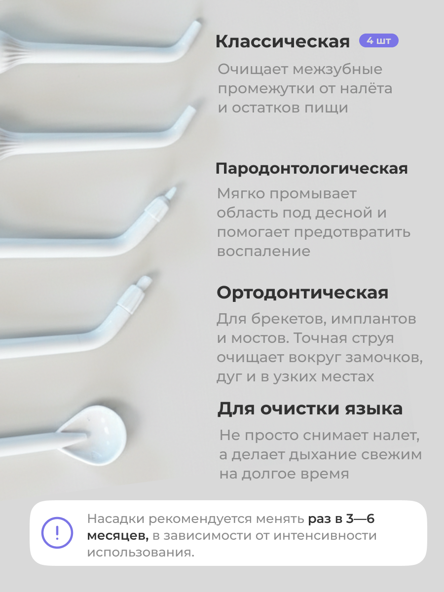 | Насадки | для чистки языка, ортодонтическая (для брекетов), пародонтологическая (для десен) |