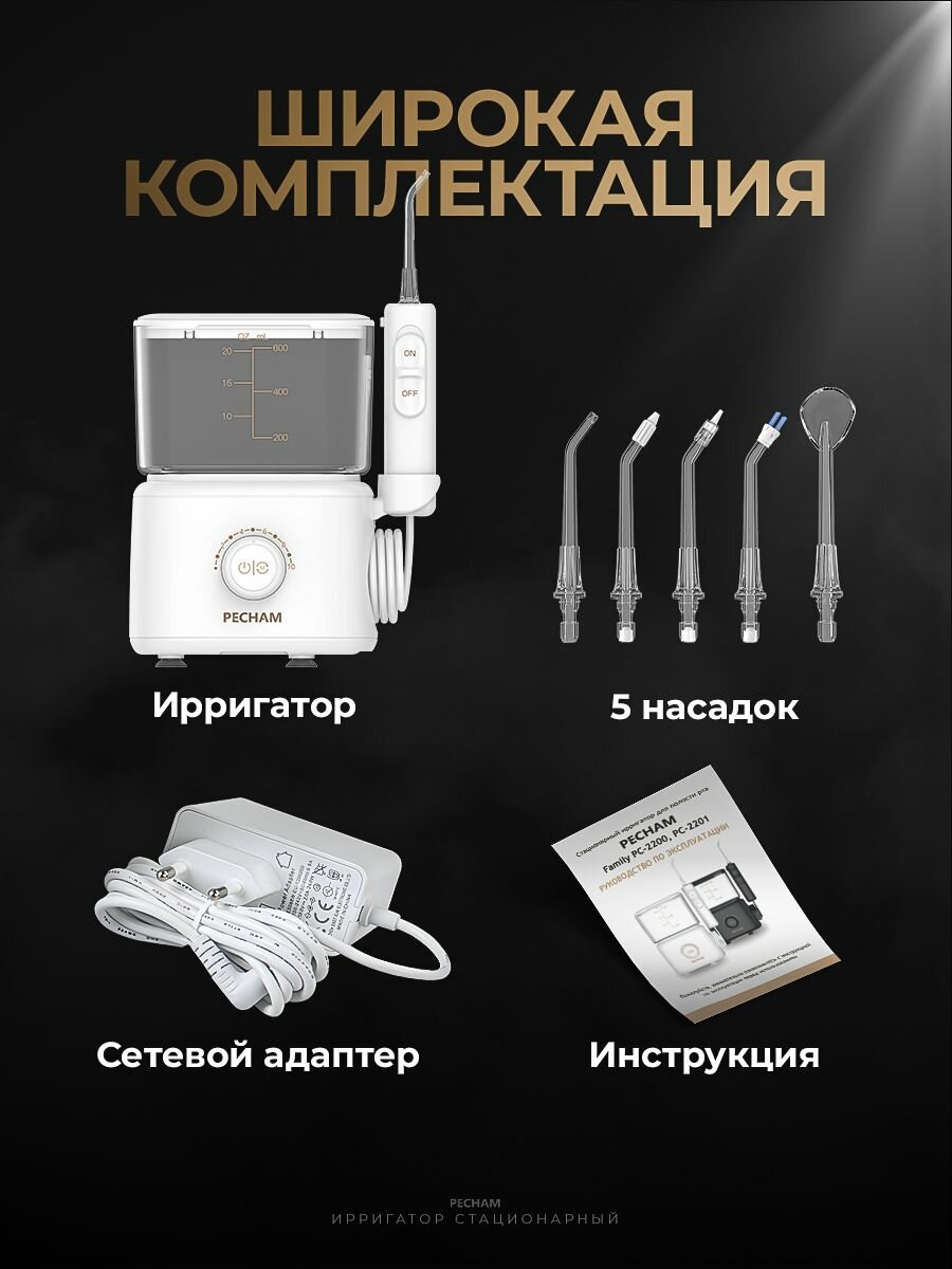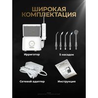 | Подробная комплектация | 1. Основной блок со шнуром питания (150 см) - стационарный ирригатор – 1 шт. 2. Ручка для ирригатора со шлангом – 1 шт. 3. Емкость для воды (600 мл) – 1 шт. 4. Крышка для емкости с футляром для хранения насадок – 1 шт. 5. Насадка стандартная – 1 шт. 6. Насадка для чистки языка – 1 шт. 7. Насадка ортодонтическая – 1 шт. 8. Насадка пародонтологическая – 1 шт. 9. Насадка для удаления зубного налета – 1 шт. 10. Руководство по эксплуатации – 1 шт. 11. Гарантийный талон – 1 шт. 12. Цветная Коробка – 1 шт. |