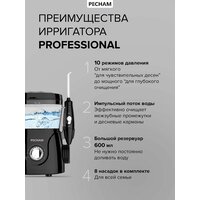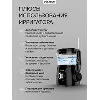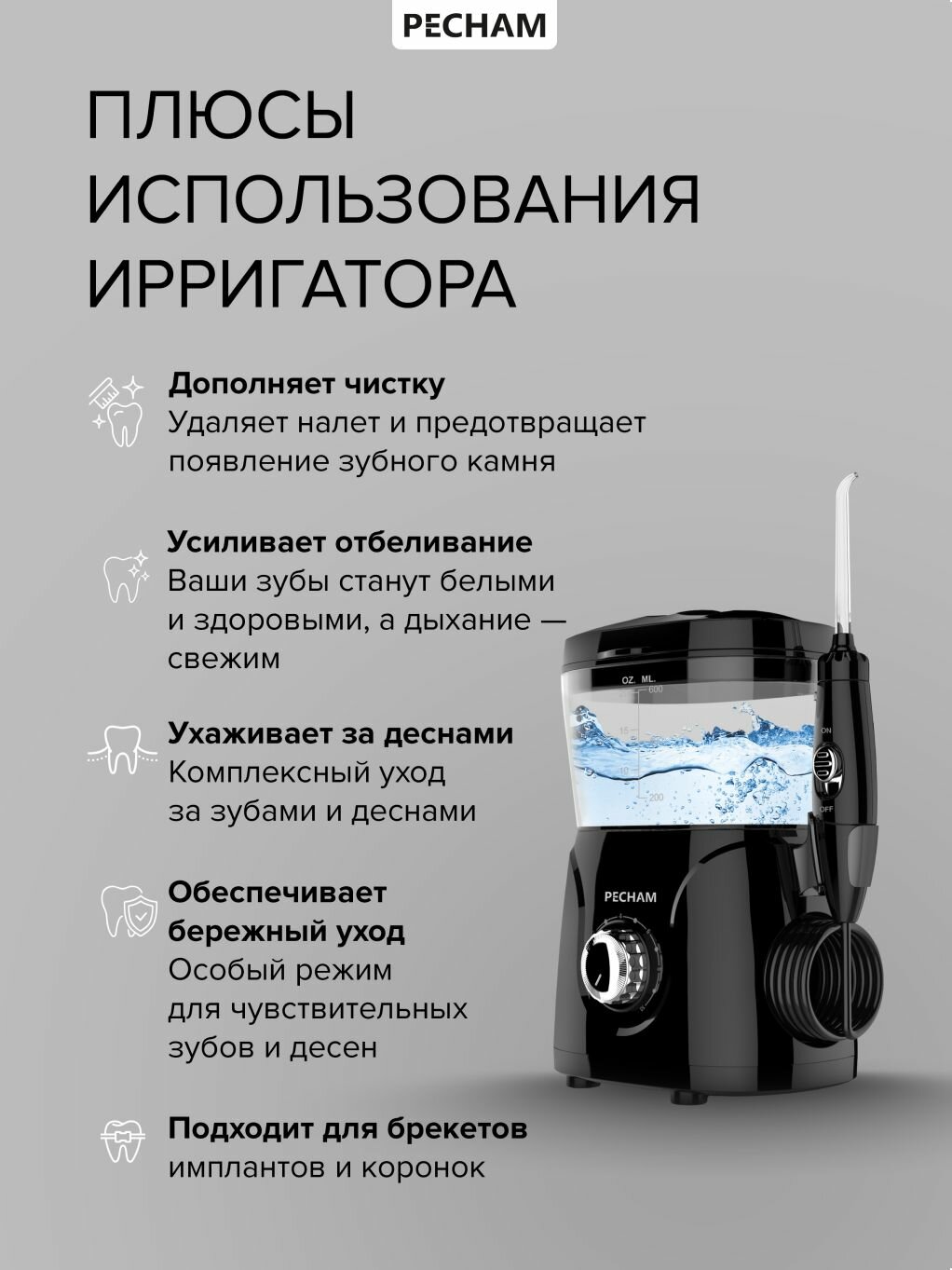 | Подробная комплектация | ирригатор; 3 классические насадки (глубоко очищает межзубные промежутки, ежедневная чистка); 1 ортодонтическая насадка (межзубное очищение при искусственных конструкциях: мосты, импланты, коронки, брекеты, ретейнеры); 1 пародонтологическая насадка (массаж десен, очищает десневой край и десневые карманы, способствует лечению гингвита, пародонтита); 1 насадка для удаления зубного налета (идеально подходит для чистки мостов, коронок и брекетов. Тщательно очищает замки и дуги); 1 ложка для чистки языка (насадка в виде лопатки-ложечки, эффективно снимает бактериальный налет с языка); 1 насадка "Зубная щетка" (щетка с эффектом ирригации) |