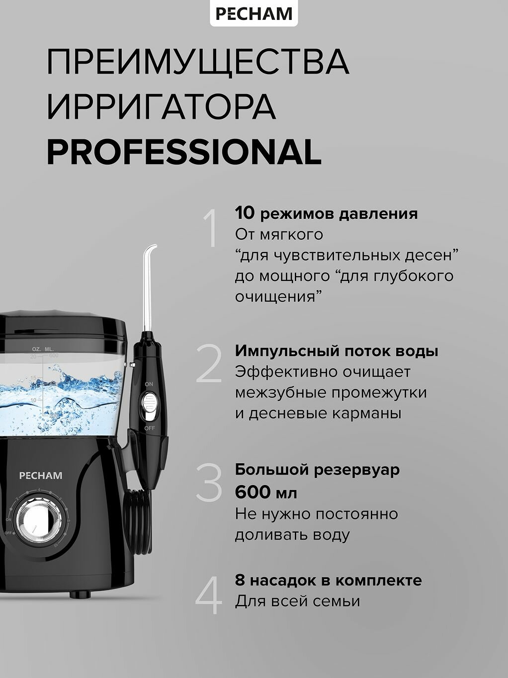 | Насадки | для струйной чистки, для чистки имплантов и коронок, для чистки языка, насадка-щетка, ортодонтическая (для брекетов), пародонтологическая (для десен) |