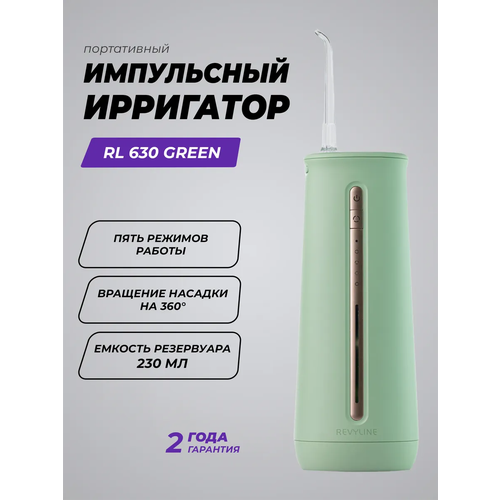 Ирригатор для полости рта Revyline RL 630 Green – портативная модель, главными особенностями которой являются усиленная влагозащита (IPX8) и разборная конструкция, предназначенная для ухода за устройством (нижняя часть блока отсоединяется от основной части поворотным движением, что помогает производить внутреннюю очистку от известкового налета, образующегося в процессе эксплуатации ирригатора).
