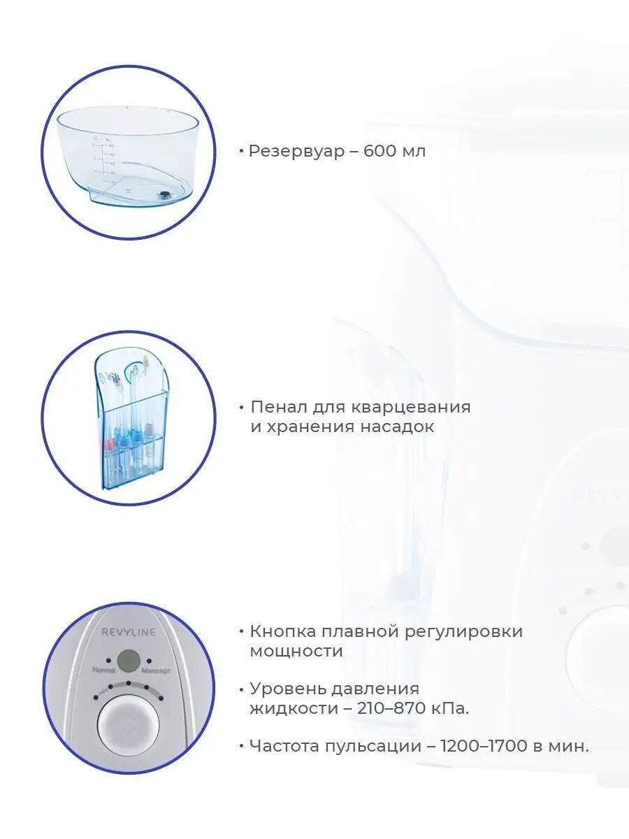 | Подробная комплектация | основной блок ирригатора Revyline RL 500; стандартная насадка – 3 шт.; пародонтальная насадка – 1 шт.; ортодонтическая насадка для ухода за конструкциями – 1 шт.; насадка для чистки языка – 1 шт.; насадка для чистки имплантов – 1 шт.; инструкция по эксплуатации |