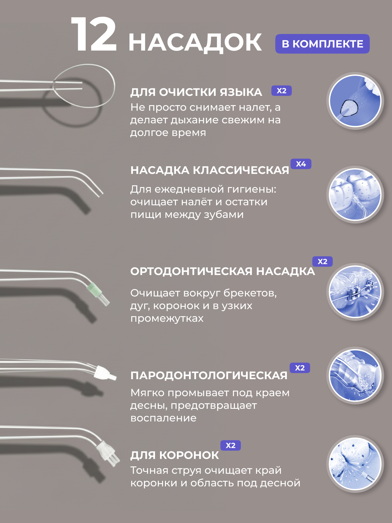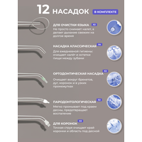 | Насадки | для струйной чистки, для чистки имплантов и коронок, для чистки языка, ортодонтическая (для брекетов), пародонтологическая (для десен) |
