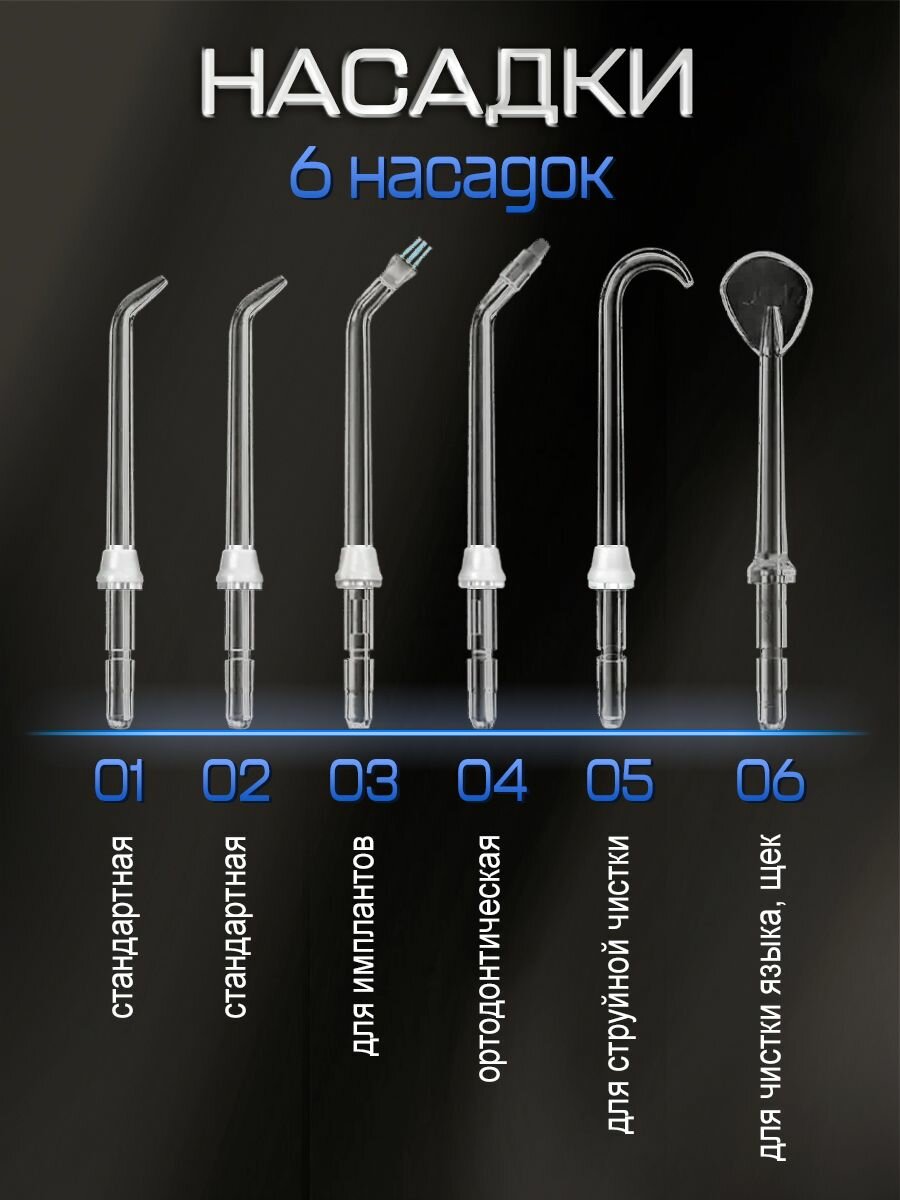 | Подробная комплектация | 2 стандартных насадки 1 ортодонтическая насадка и 1 насадка для коронок, мостов и имплантатов 1 насадка для языка 1 насадка для имплантатов шнур USB Type-A без адаптера |