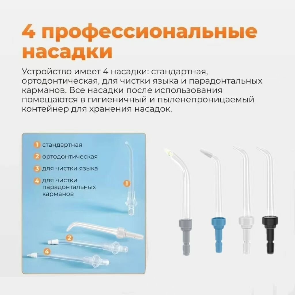 | Насадки | насадка-щетка, ортодонтическая (для брекетов), для струйной чистки, пародонтологическая (для десен), для чистки имплантов и коронок, назальная, для чистки языка |