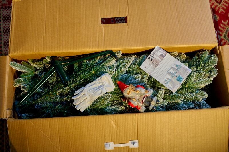 В комплекте с елкой вы получаете подставку, коробку, инструкцию, секретный подарок, перчатки для сборки и металлическую крестовину.
