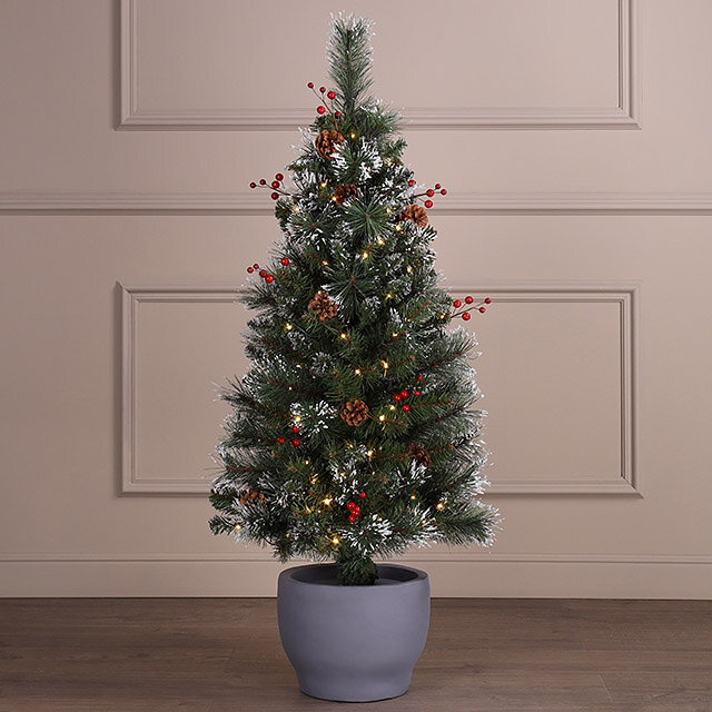 Купить Искусственная елка с лампочками Ягодка 120 см в кашпо, 80 теплых белых ламп на батарейках, контроллер, леска + ПВХ, IP44 с доставкой по всей России.