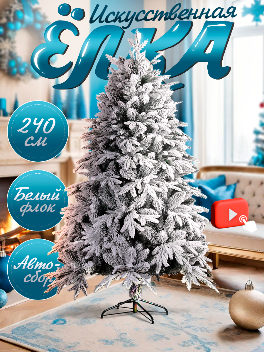 Елка искусственная, с белым напылением, 240см, литая хвоя, на крестовине, разборная, заснеженная