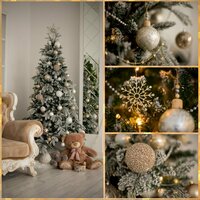 Литые иголки передней части веток выглядят абсолютно натурально, и с расстояния в три шага, смотрится как живая ёлка. Мягкая хвоя (Пвх) маскирует ствол, а ветки из нее расположенные во внутренней части придают пышности. Декор искусственный снег (флок) придаёт вид свежевыпавшего рыхлого снега.