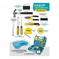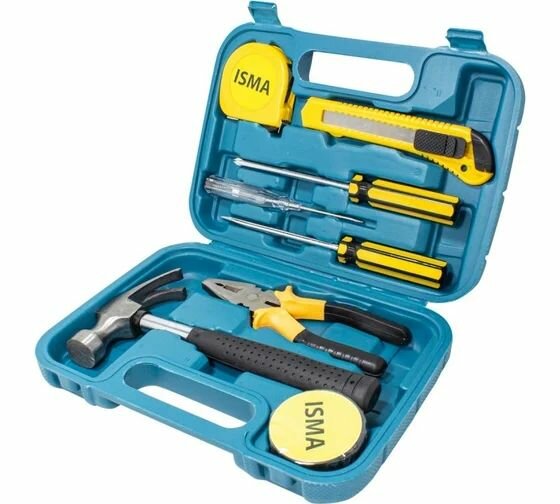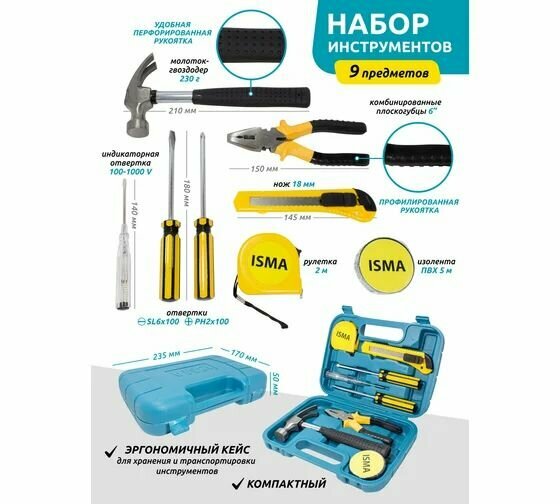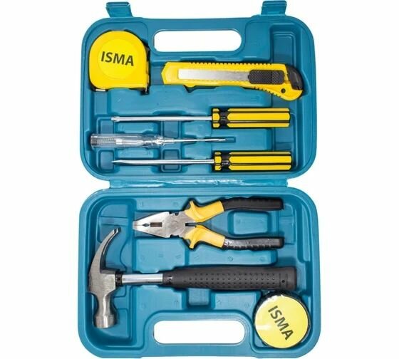 ISMA Набор инструментов 9пр.(плоскогубцы, нож, рулетка, отвертки, изолента, молоток ) в кейсе ISMA-10009(50621): сравнение цен, характеристики, фото, актуальное наличие и цены.