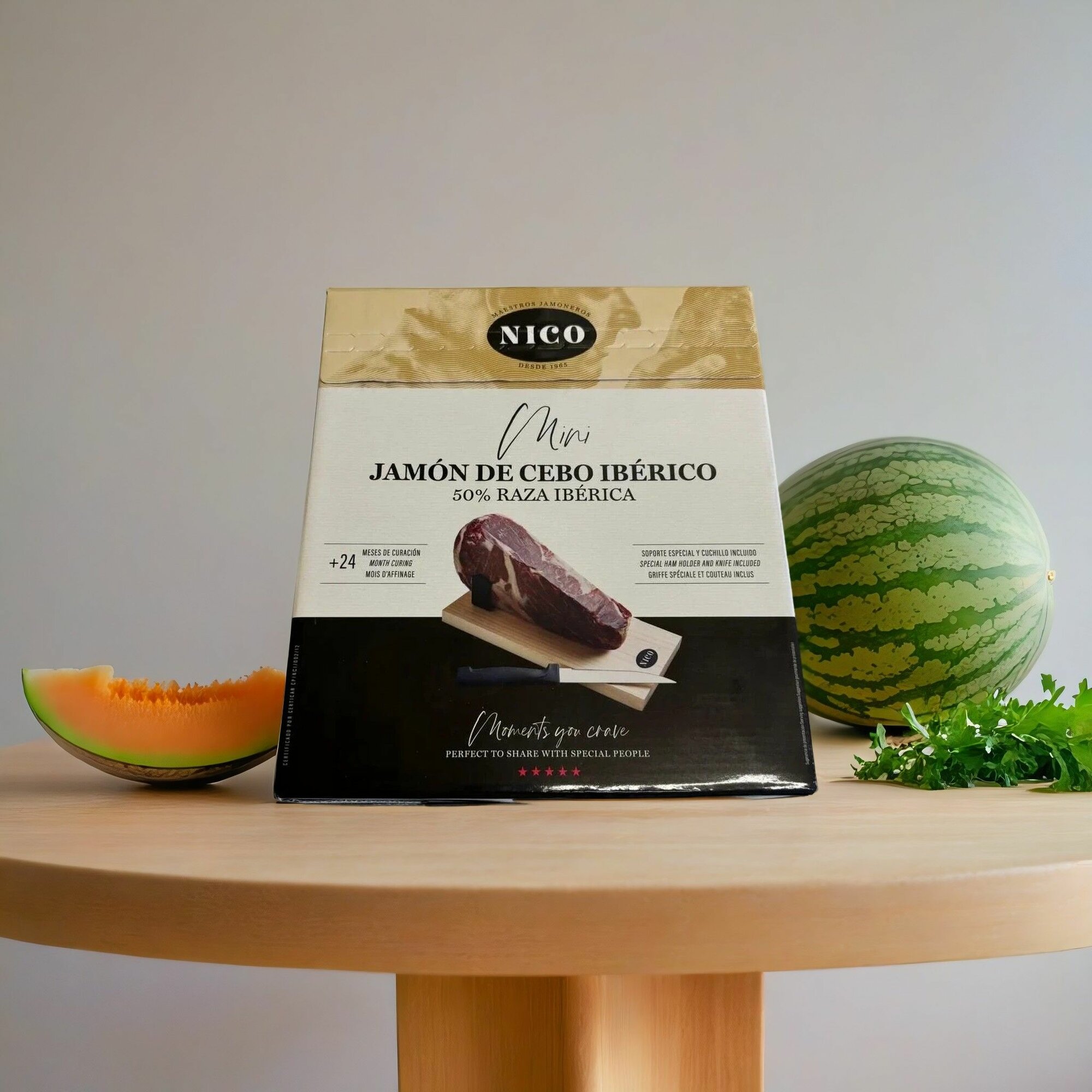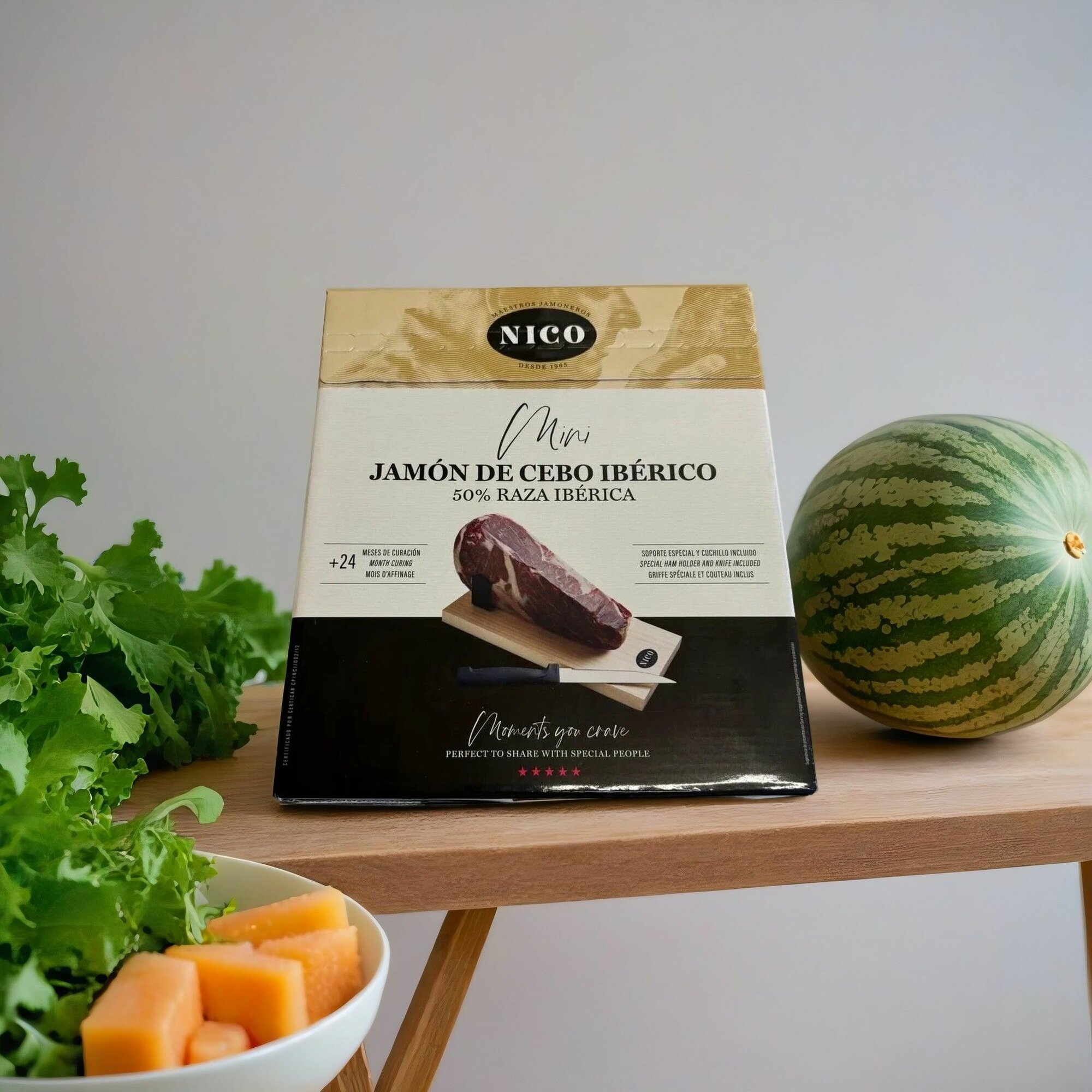 Позвольте себе окунуться в мир испанских вкусов с уникальным подарочным набором - испанским хамоном иберико Nico. Этот деликатес весом 1 кг станет настоящим открытием для любителей вяленого мяса и гурманов. Испанский хамон, изготавливаемый из отборного мяса свиней Иберийской породы, обладает неповторимым вкусом, который подарит вам незабываемые ощущения.