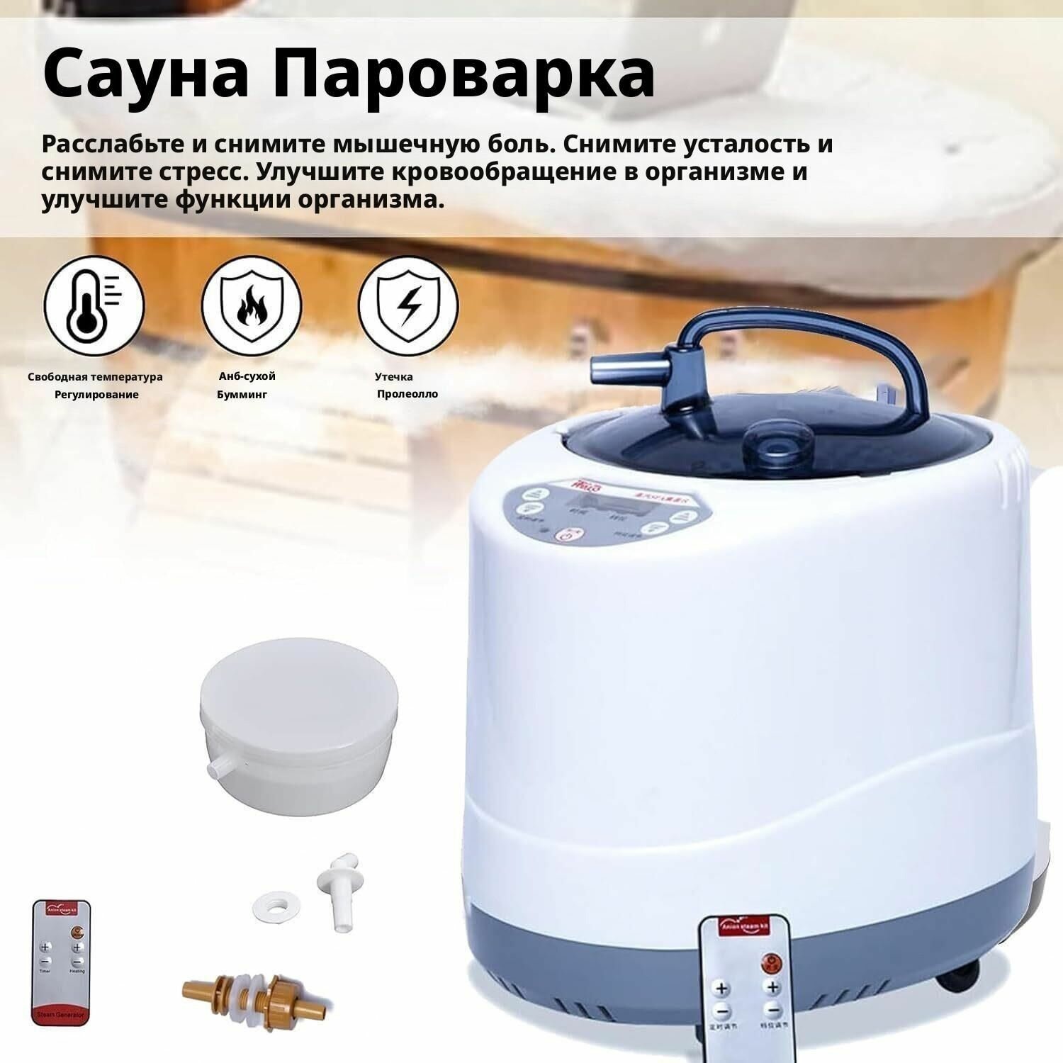 Портативная пароварка: Насладитесь максимальным расслаблением с этой ультратонкой пароваркой с дистанционным управлением, оснащенной функцией таймера для автоматического включения. Защита: будьте спокойны, ведь эта пароварка оснащена сигнализацией об отсутствии воды в резервуаре, а также регулируемыми уровнями для удовлетворения ваших потребностей. Автоматическое отключение: Микрокомпьютер с датчиком температуры обеспечивает защиту нагревательной пластины и продлевает срок ее службы, обеспечивая спокойствие во время каждого сеанса приготовления на пару. Высококачественные материалы: Внутренний резервуар пароварки изготовлен из нержавеющей стали марки 304, не имеет сварных швов, имеет взрывобезопасную конструкцию, защиту от сухого ожога и защиту от протечек. Внимание: Для поддержания оптимальной производительности всегда заворачивайте китайскую медицину в тканевый мешок перед использованием, избегайте попадания фумигантной жидкости непосредственно в кастрюлю и воздержитесь от использования легковоспламеняющихся веществ. Подробности Благодаря паровой бане вы можете наслаждаться всеми жизненно важными преимуществами настоящей сауны в комфорте собственного дома. Просто установите ее в выбранной вами комнате и наслаждайтесь естественным лечением, которого вы заслуживаете. 2. портативная паровая машина с таймером для терапии тела, помогает снять стресс и усталость в определенной степени. Парогенератор сауны может помочь вам расслабиться и снять мышечную боль. Подходит для паровой бани, деревянной бочки, ванны. 3. Окуривание может активировать клетки, улучшить физическое состояние и повысить иммунную функцию. 4. сауна машина может регулировать эндокринную систему, улучшить регулирование и профилактику гинекологических заболеваний и веснушек. Способствовать циркуляции крови в организме и улучшать функции организма. Сжечь лишний жир, похудеть и сделать фигуру более рельефной. Параметры изделия: Мощность: 2000 Вт Объем: 4 литра Установка времени: 0-99 минут Материал кастрюли: ABS пластик + внутренняя часть из нержавеющей стали Назначение: Парогенератор Цвет: Белый Вес: 1,8 см Размер: 29*23*29 см В комплект входят: Парогенератор*1 Шланг*1 Пульт дистанционного управления*1Красивые продукты