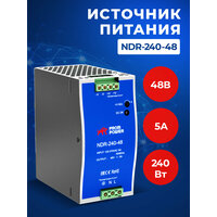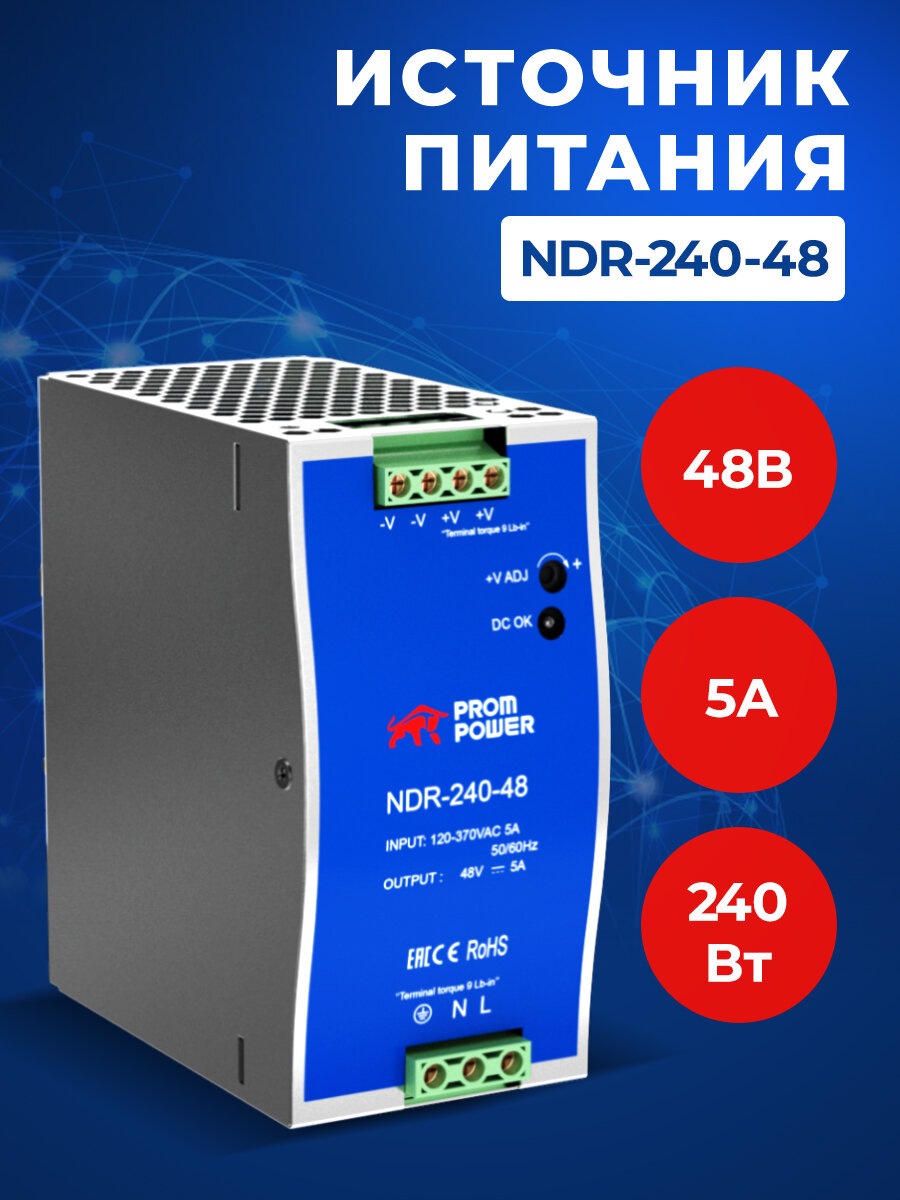 Импульсный источник питания NDR-240-48 в прочном металлическом корпусе преобразует входное напряжение 85-264В переменного тока или 120-370В постоянного тока в выходное напряжение 48В постоянного тока и рассчитан на подключение выходной нагрузки мощностью до 240Вт с номинальным током до 5А.
