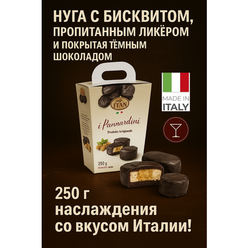 Почувствуйте вкус Италии с нугой Pannardini — изысканным десертом по старинному рецепту. В каждом кусочке гармонично сочетаются нежная нуга с обжаренным миндалём, воздушный бисквит с благородным ликёром и гладкий тёмный шоколад.