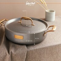 В комплект входит кастрюля объемом 4,5 литра и крышка диаметром 28 см.