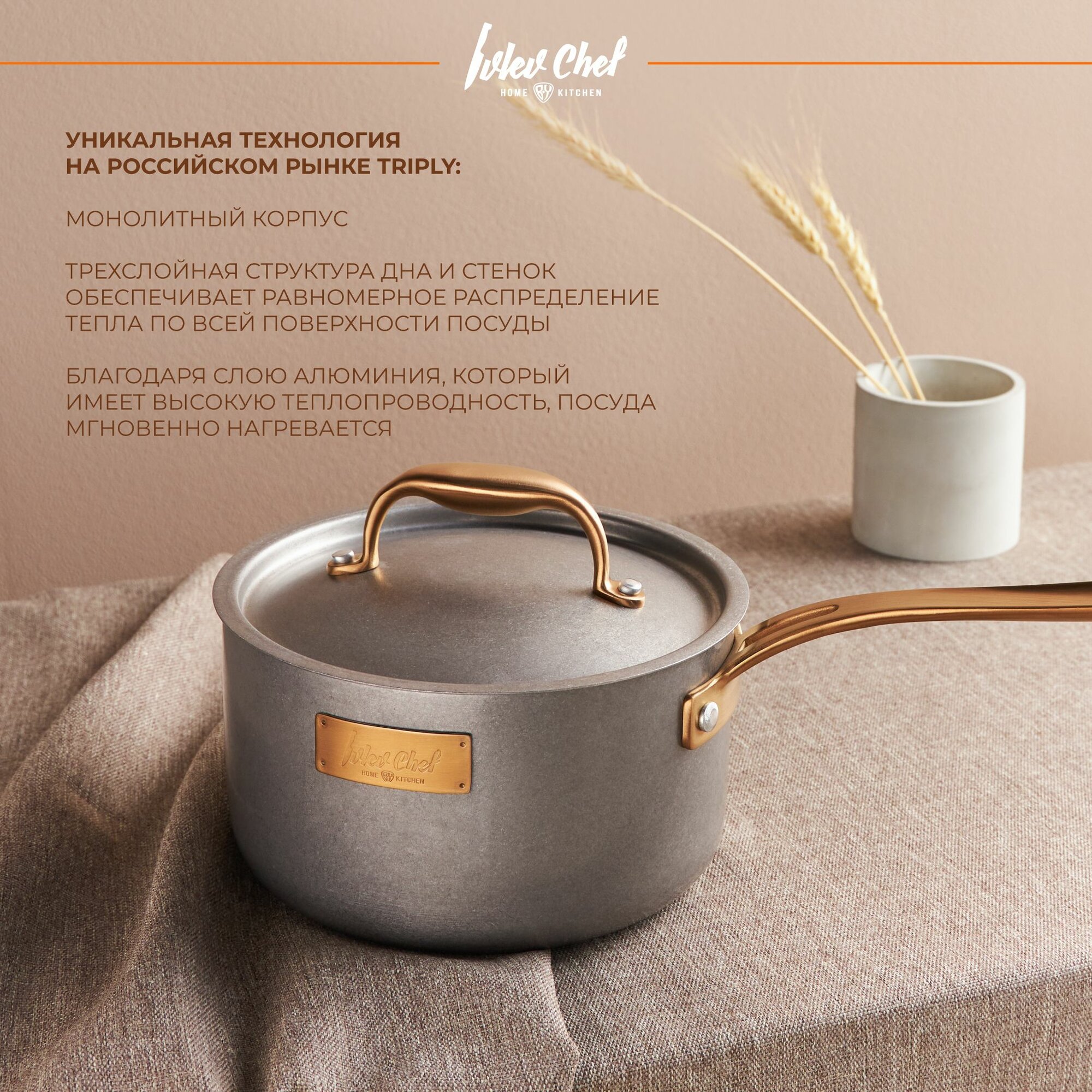 Многослойное дно ковша равномерно распределяет тепло по всей поверхности, предотвращая пригорание пищи.