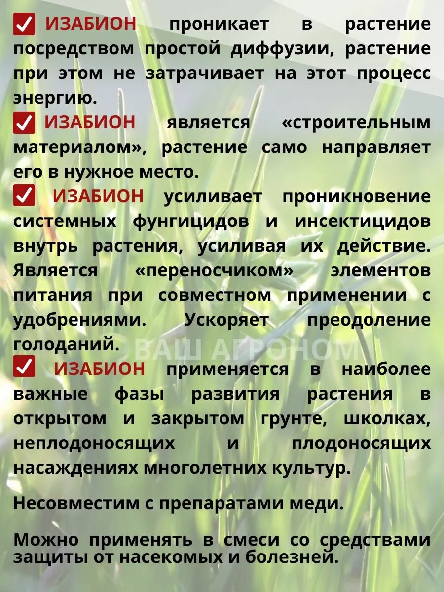 изабион проникает в растение посредством простой диффузии, растение при этом не затрачивает на этот процесс энергию. Изабион является «строительным материалом», растение само направляет его в нужное место. Изабион усиливает проникновение системных фунгицидов и инсектицидов внутрь растения, усиливая их действие. Является «переносчиком» элементов питания при совместном применении с удобрениями. Ускоряет преодоление голоданий.